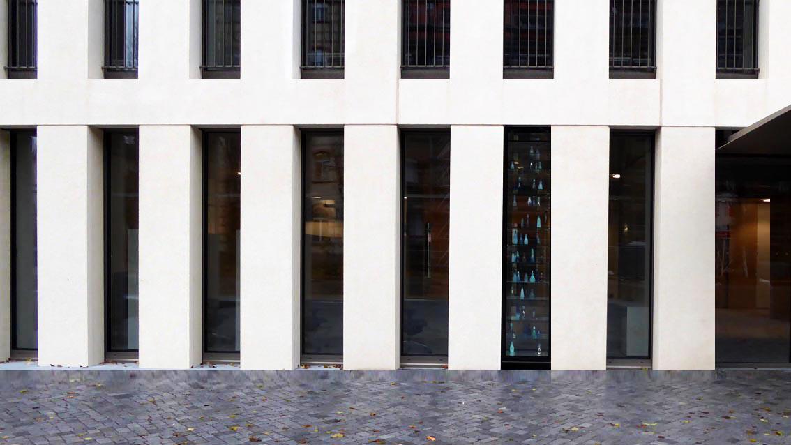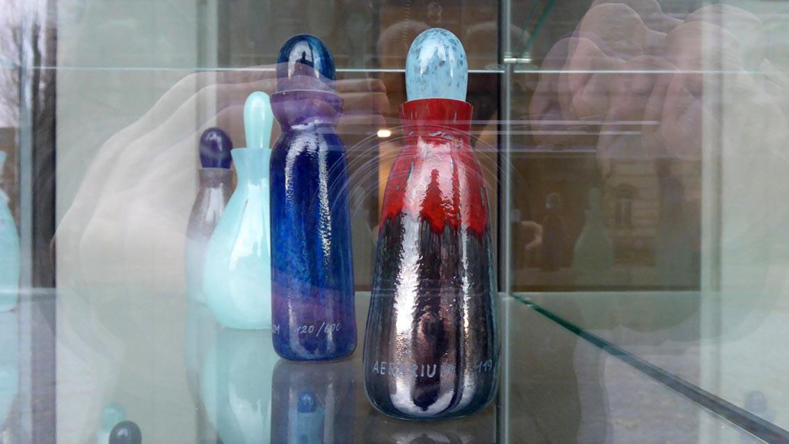 AERARIUM ging als Siegerarbeit aus einem eingeladenen Kunst-am-Bau Wettbewerb für den Neubau des Karlsruher Finanzamtes hervor. Die Tatsache, dass sich auf dem Neubaugelände ehemals die Parfümerie F. Wolff und Sohn befand sowie der Fund eines grünen, waldgläsernen Parfümflakons aus der frühen Neuzeit nahe Karlsruhe, inspirierte die Konzeptkünstlerin, ein Duftwasser entwickeln zu lassen, das nach frisch gedrucktem Geld riecht. Das Parfüm wurde in 600 Flakons abgefüllt, entworfen von der Künstlerin und produziert in der Wolfacher Dorotheenhütte. Präsentiert in einer Glasvitrine neben dem Haupteingang, warten die individuell gestalteten Glasbehälter mit dem ‚(S)teuerduft‘ auf kunstinteressierte und solvente Käufer*innen. Die Flakonpräsentation vor Ort wird durch flankierende Maßnahmen beworben. Die Künstlerin schreibt dazu in ihrem Konzept: „…Und eine Kampagne wirbt mittels Zeitungsanzeigen und Plakaten Im Stadtzentrum: AEARIUM – Ihr Steuerduft! Jetzt exklusiv im Finanzamt Karlsruhe!“. Katharina Hohmann studierte bis 1991 an der Hochschule der Künste in Berlin. Verschiedene Auslandsstipendien führten sie nach Marseille, Rom und Istanbul. Zwischen 1999 und 2005 arbeitete sie als künstlerische Mitarbeiterin an der Bauhaus Universität in Weimar. Seit 2007 lehrt sie an der Haute École d’Art et de Design in Genf. Sie lebt in Genf und Berlin.