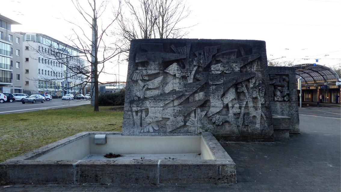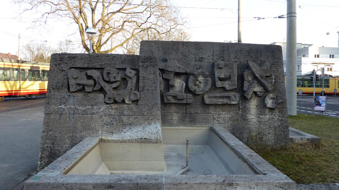 Per Brief erinnerte im Jahre 1960 der in Karlsruhe vielfach vertretene Künstler die Stadt Karlsruhe an ein Versprechen hinsichtlich eines Ankaufs wegen seiner Erfolge bei den Olympischen Spielen im Jahre 1936. Damals gewann er für seine Reliefs "Hürdenläufer" (heute im Museum in Tokio) und "Eishockeykampf" eine Goldmedaille im Bildhauerwettbewerb der Spiele in der Kategorie Reliefs. Nach dem Schreiben wurde Sutor tatsächlich beauftragt, den Brunnen am heutigen Albtalbahnhof zu gestalten. Im Zentrum der Anlage stehen zwei Steinflächen, die mit Reliefs versehen sind, welche abstrahierte Motive aus der Natur zeigen. Die gewählte Formensprache ist typisch für die Kunst der 60er Jahre des letzten Jahrhunderts.