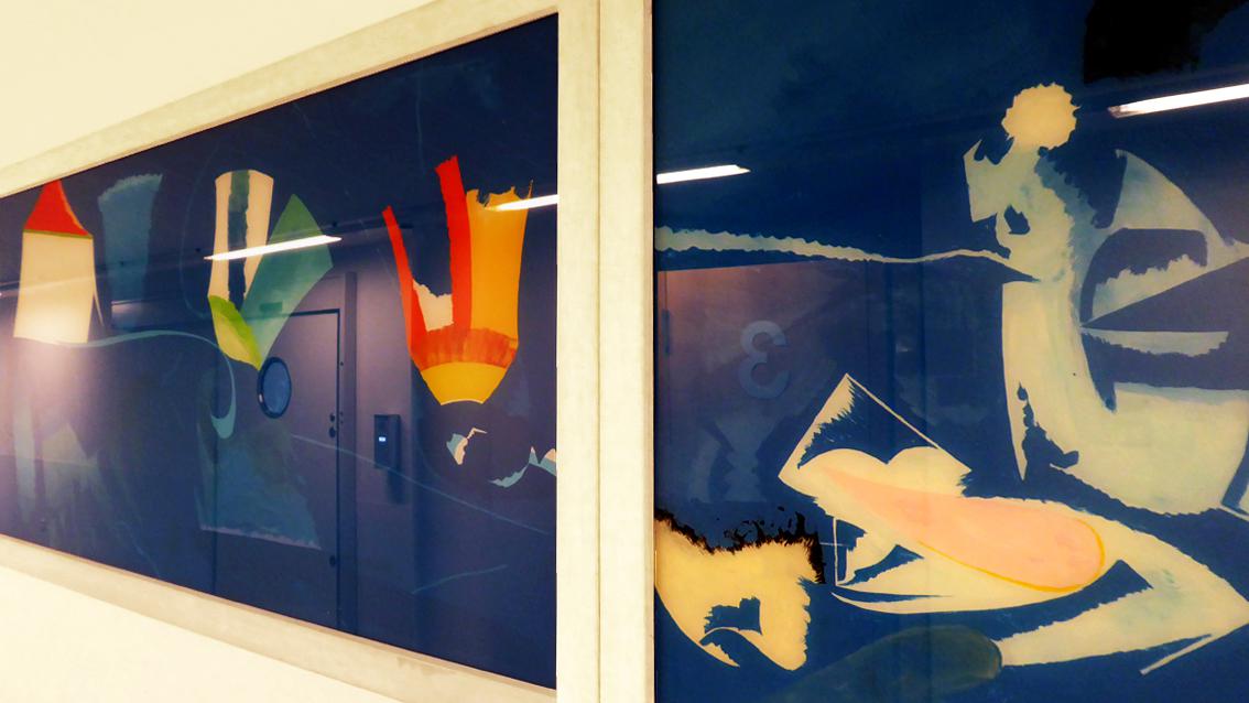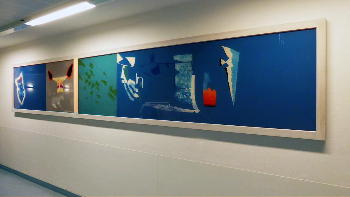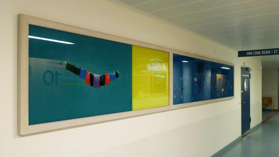 Der Karlsruher Künstler ist bekannt für Gemälde und Objekte, die der Fantasie der Betrachter*innen viel Freiraum geben. In der mehrteiligen Bildfolge im Haus R des Städtischen Klinikums wird Reales angedeutet, um sich im nächsten Moment in verselbständigte Farbe und Form zu verwandeln. Wahrzunehmen sind verdichtete, surreale Bildausschnitte vor stark farbigen Hintergründen, umrahmt von stabilen Holzleisten. Die zum Teil überlängten Querformate passen sich den räumlichen Vorgaben folgerichtig an. Die Gesamtintervention von Guido Kucznierz, der an der Staatlichen Akademie der Bildenden Künste in Karlsruhe ausgebildet wurde, ist Ergebnis eines eigenständigen, künstlerischen Gestaltungsprozesses.