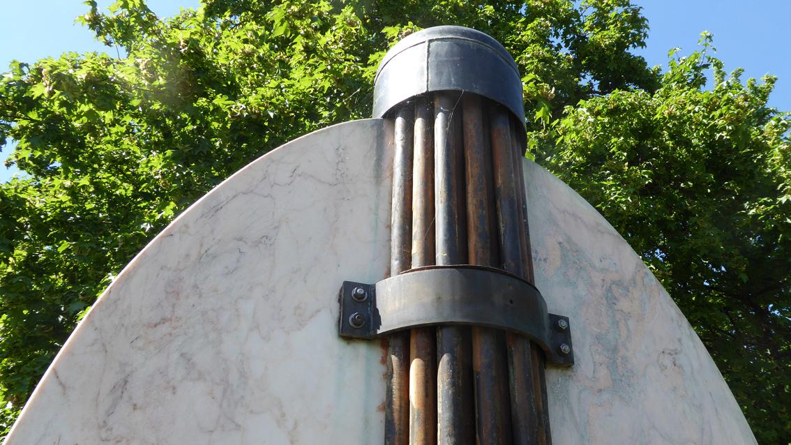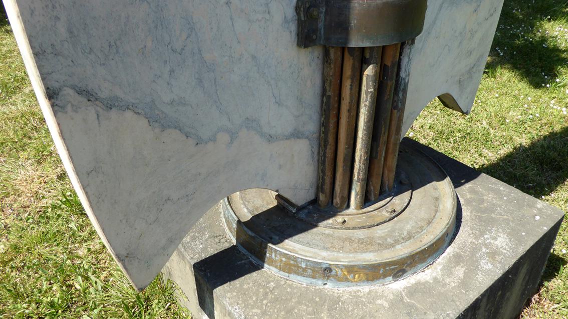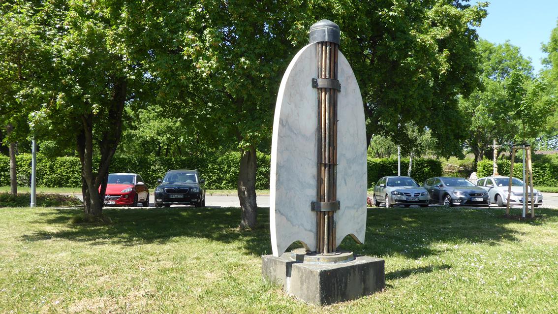 Daphne ist in der griechischen Mythologie eine Bergnymphe und Priesterin der Mutter Erde. Ihr Thema ist Verwandlung: Vor Apollon fliehend, der sie bedrängt, verwandelt sie sich in einen Lorbeerbaum. Die Daphne des Absolventen der Staatlichen Akademie der Bildenden Künste Karlsruhe gleicht einem Engel mit ausgebreiteten Flügeln. Sie ist symmetrisch aufgebaut, ein Bündel Kupferrohre betont die Vertikale. Der helle portugiesische Marmor und die rötlich braunen Rohre bilden einen markanten Material-, Farb- und Formgegensatz.