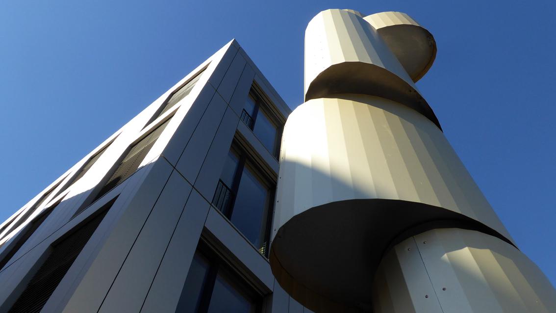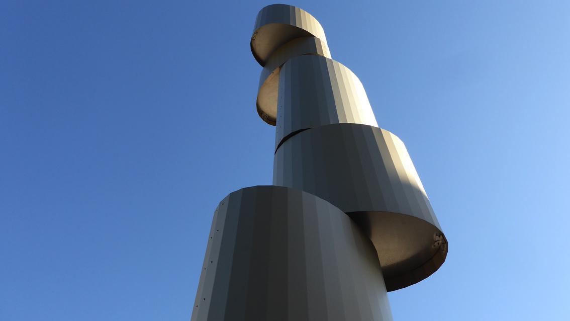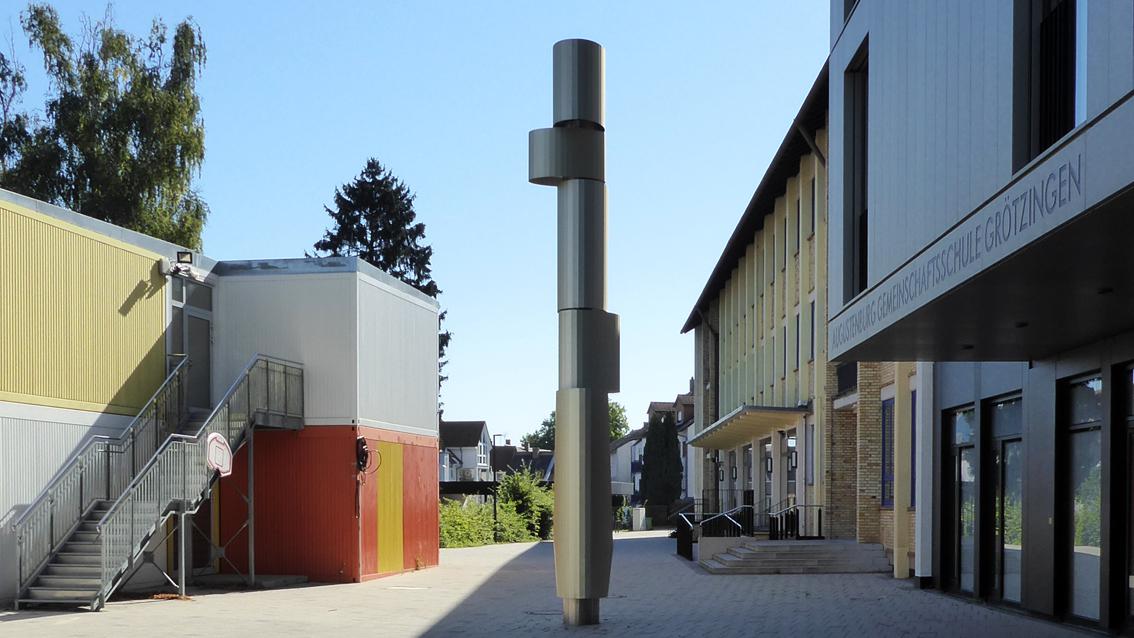 Für den Eingangsbereich des Neubaus der Augustenburg Gemeinschaftsschule in Grötzingen entwickelte und verwirklichte der Düsseldorfer Bildhauer eine acht Meter hohe Plastik. Über eine zentrale Achse verbunden, bilden fünf unterschiedlich dimensionierte Teilformen eine Säule. Das unterste Element ist manuell drehbar, wodurch die Formen darüber sich langsam mitbewegen. Das Kunstwerk steht in der Tradition des künstlerischen Minimalismus und der kinetischen Plastik. Klare Formen in vertikaler Ausrichtung und spielerische Interaktion verbinden sich bei ‚Dreh‘ zu einem stetig sich verändernden, markanten Zeichen im öffentlichen Raum. Martin Pfeifle wurde im Jahre 1975 in Stuttgart geboren. Von 1998 bis 2005 studierte er an der Kunstakademie Düsseldorf bei den Professoren Tony Cragg und Hubert Kiecol, bei dem er 2004 Meisterschüler wurde. Von 2009 bis 2010 hatte der Bildhauer eine Vertretungsprofessur an der Staatlichen Akademie der Bildenden Künste in Karlsruhe inne.