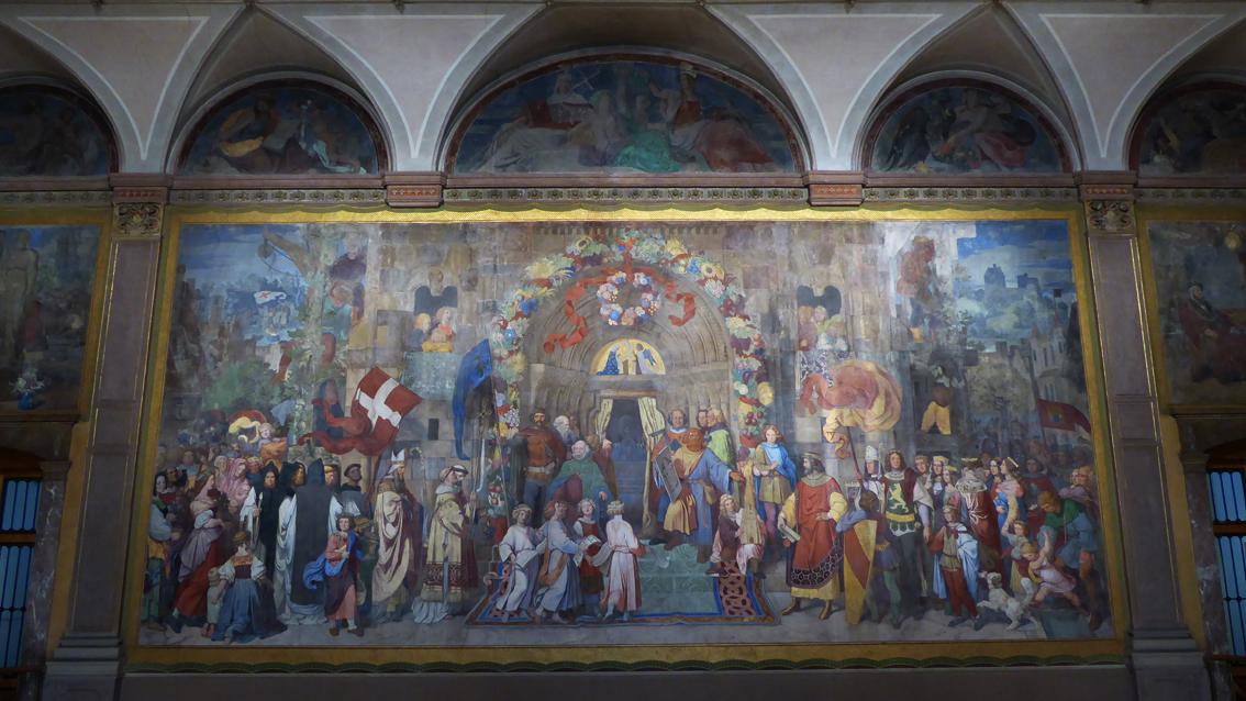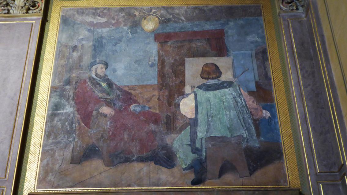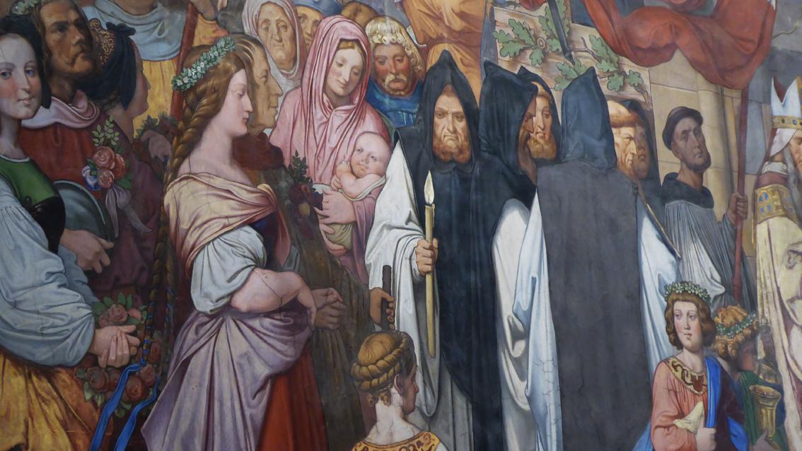 Die Staatliche Kunsthalle Karlsruhe ist mit ihren Kunstwerken, vor allem deutscher, französischer und niederländischer Meister, eines der bedeutendsten Museen Deutschlands. Das Hauptgebäude und die Orangerie bilden ein von Heinrich Hübsch zwischen den 30er und den 50er Jahren des 19. Jahrhunderts entworfenes und verwirklichtes Ensemble, das die romantische Vorstellung eines Gesamtkunstwerks überliefert. Im Jahre 1838 wurde die Ausmalung des Treppenhauses des Hauptgebäudes beschlossen. Im Mittelpunkt sollte die Einweihung des Freiburger Münsters durch Herzog Berthold, einem Zähringer stehen. Moritz von Schwind (1804-1871) wurde mit dem Entwurf und der Ausführung des Wandbildes beauftragt, das eine große Anzahl von Figuren vor dem Portal des Gotteshauses zeigt. Im Jahre 1842 beantragte Heinrich Hübsch eine Erhöhung der festgelegten Gesamtsumme, um neben dem Münsterbild weitere Bildfelder an den Wänden ausmalen zu lassen. Für die sieben mittleren Deckenfelder schuf der spätromantische Maler mit österreichischen Wurzeln vierzehn schwebende Engel. Die Lünetten, die Rundbogenfelder über dem Hauptbild, wurden ebenfalls von Schwind ausgeführt. Die beiden Äußeren thematisieren die ‚Phantasie‘ und die ‚Mathematik‘, die damals als Grundlage guter Baukunst galten. Der Titel des Freskos des mittleren Bogenfelds lautet ‚Die Architektur von Staat und Kirche beschützt‘. Nach 1842 malte der Künstler zusätzlich die beiden quadratischen Felder über den Türen aus, die in die Sammlung führen. Das linke Fresko zeigt „Sabine, Tochter Erwins von Steinbach mit der Bildhauer-Arbeit des Straßburger Münsters beschäftigt“. Das rechte Wandbild gibt wieder, wie Herzog Berthold der Reiche durch den Maler Baldung Grien porträtiert wird.