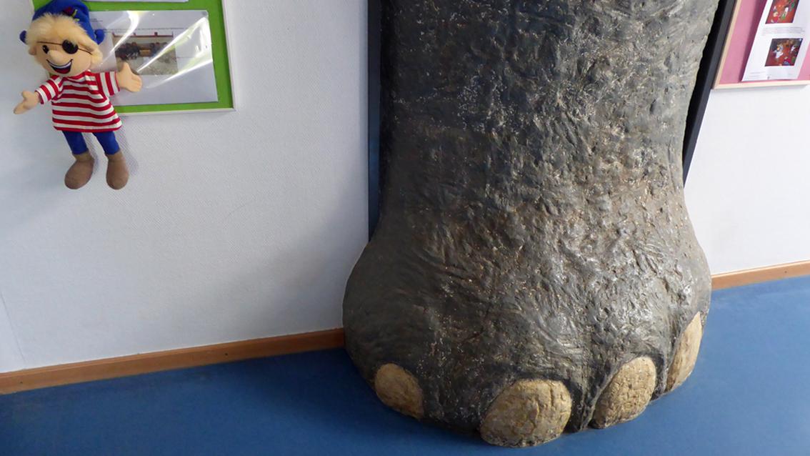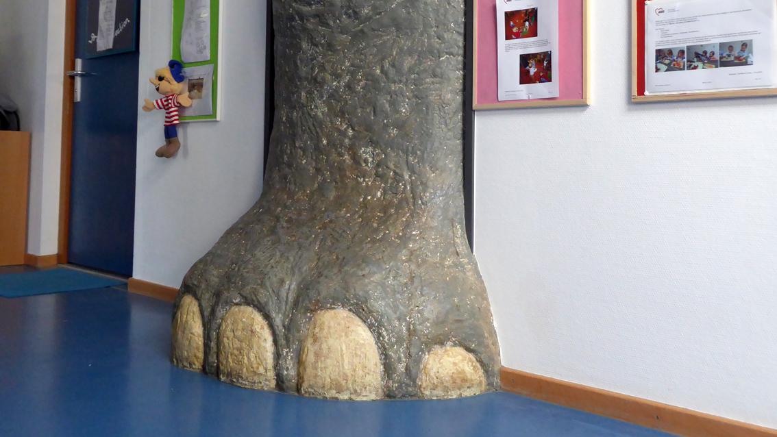 In der Kindertagesstätte ‚Les Petits Amis‘ mit bilingualem Schwerpunkt in Deutsch und Französisch drängt ein monumentales Elefantenbein durch eine Türöffnung in den Innenraum. Der naturnahe Illusionismus lässt befürchten, dass ein riesenhaftes Tier hinter der Tür lauert… Axel Philipp wurde 1956 in Karlsruhe geboren. Er studierte ab 1986 an der Staatlichen Akademie der Bildenden Künste Karlsruhe bei Prof. Rainer Küchenmeister. 1992 schloss er sein Studium mit dem Diplom und als Meiserschüler ab. Von 2004 bis 2005 hatte er am Ort seiner Ausbildung eine Vertretungsprofessur inne. 2006 führte ihn ein Stipendium an die Cité des Arts nach Paris.