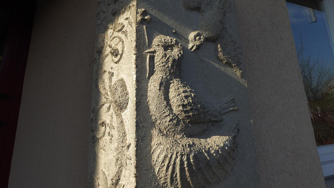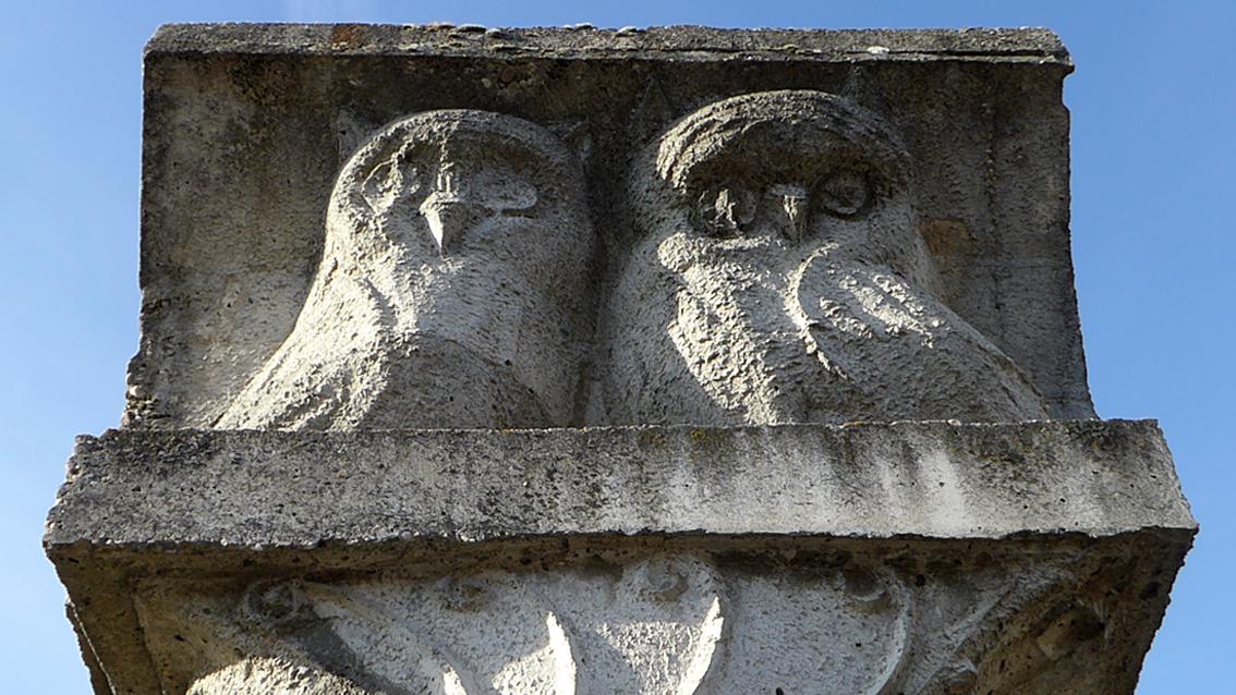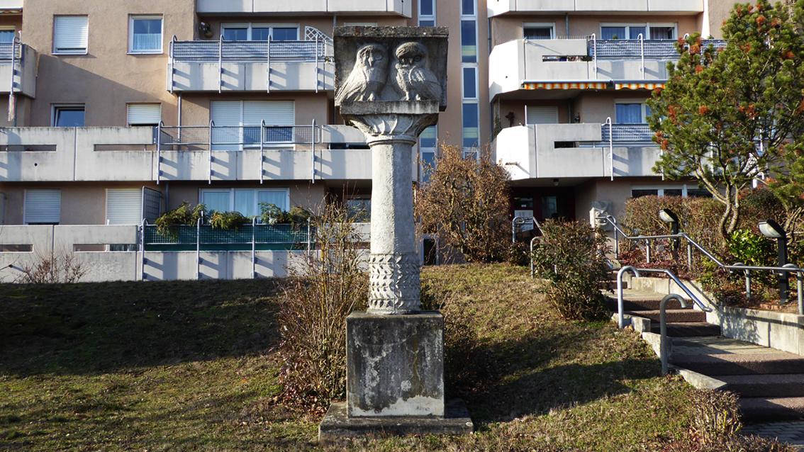 Vor dem Johann-Volm-Haus, einem Altenwohnheim mit Betreuung der Karl-Friedrich-, Leopold- und Sophienstiftung Karlsruhe, befindet sich eine Säule mit zwei Eulen des in Karlsruhes öffentlichem Raum mehrfach vertretenen Bildhauers, Malers und Glasgestalter Emil Wachter. Die Eulengruppe nimmt aus sicherer Distanz und eng aneinander geschmiegt, Kontakt mit den entlang Flanierenden auf. Auf der Rückseite des Betongusses ist ein Raubtier, möglicherweise ein Fuchs dargestellt, der eine Bedrohung des Eulenpaares sein könnte. Am Gebäudeeingang des Johann-Volm-Hauses befinden sich an einem Eckrelief zwei Vögel beim Nestbau, umgeben von einer rankenden Pflanze.