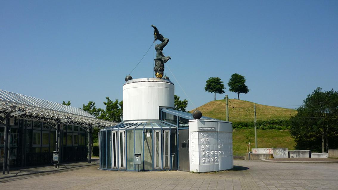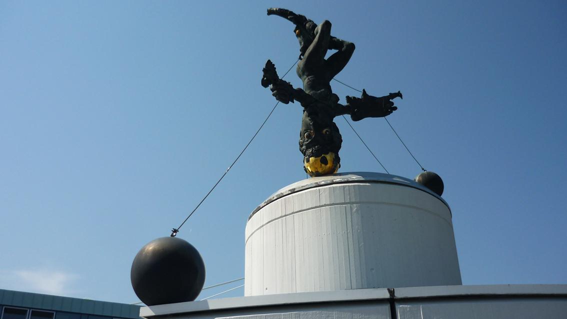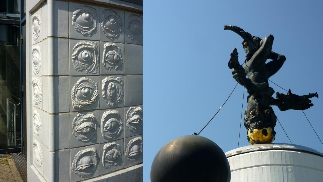 Der in Karlsruhe mehrfach vertretene Künstler deutet seine Europa als Akrobatin, die kopfüber auf einer goldenen Kugel balanciert. Die anspielungsreiche und derbe Bildsprache des Künstlers führte dazu, dass der damalige Oberbürgermeister Otto Dullenkopf sich weigerte, das Kunstwerk feierlich zu enthüllen, wie das normalerweise üblich ist. Ergänzt wird die Bronzeplastik durch Felder mit weißen Reliefs, die in vielen Varianten menschliche Augen zeigen.