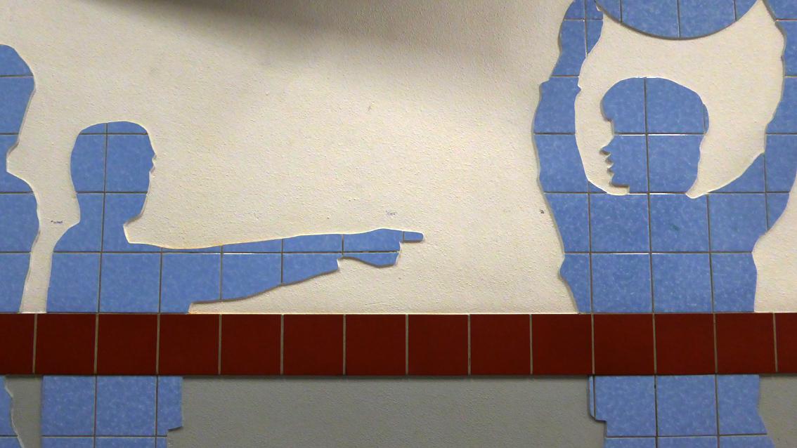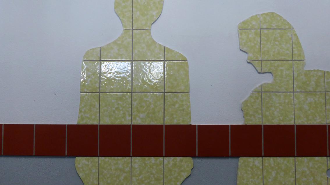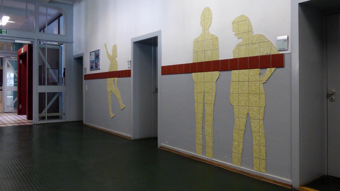 Im Erdgeschoß und der ersten Etage der Nebenius-Realschule befinden sich zwei Kachelbilder von Gunvor Singer-Helevae. In einer Darstellungsform, die an Schattenrisse erinnert, stellen sie Kinder, Jugendliche und Erwachsene beim gemeinsamen Spiel und im gegenseitigen Austausch dar. Die Bildsprache ist elementar. Hellgrüne und hellgelbe Kacheln fügen sich zu wirklichkeitsnahen Szenen mit Figuren die - ungefähr in Lebensgröße wiedergegeben - untereinander in Beziehung stehen.