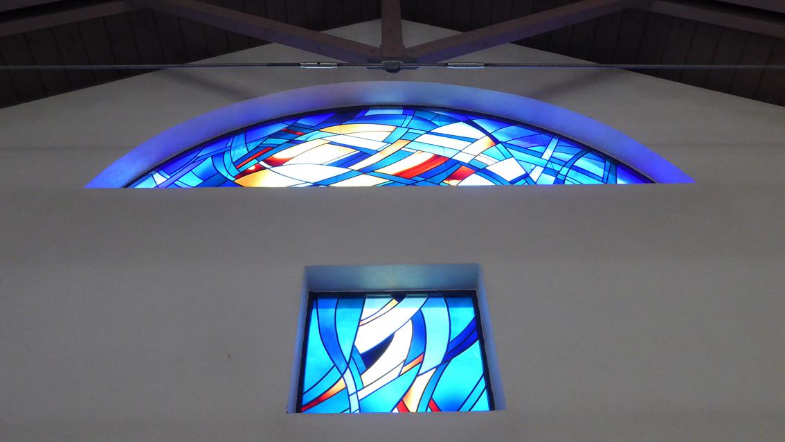 Das Karlsruher Künstlerpaar Barbara Jäger und OMI Riesterer ist in Karlsruhe und Umgebung mit künstlerischen Interventionen im öffentlichen Raum und an Gebäuden mehrfach vertreten. In der Aussegnungshalle des Friedhofs in Aue füllten sie die Öffnungen der Hauptwand mit farbigem Glas. Sich durchdringende Bögen in Abstufungen der Grundfarben Blau, Gelb und Rot bilden insgesamt sieben Flächen. Im Bogenfeld herrschen Formen mit horizontaler, in den schlanken Hochformaten mit vertikaler Ausrichtung vor. Die Gesamtkomposition ist von einer farbintensiven Dynamik getragen, die sich von der Sachlichkeit der Architektur und der Einrichtung kontrastreich abhebt.