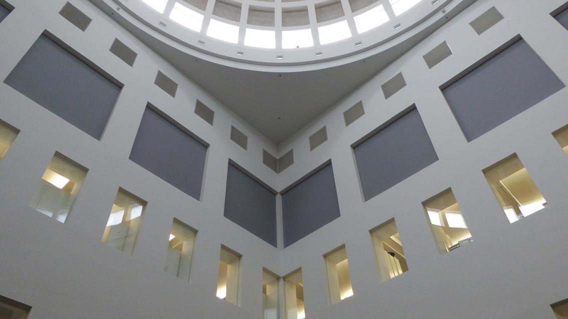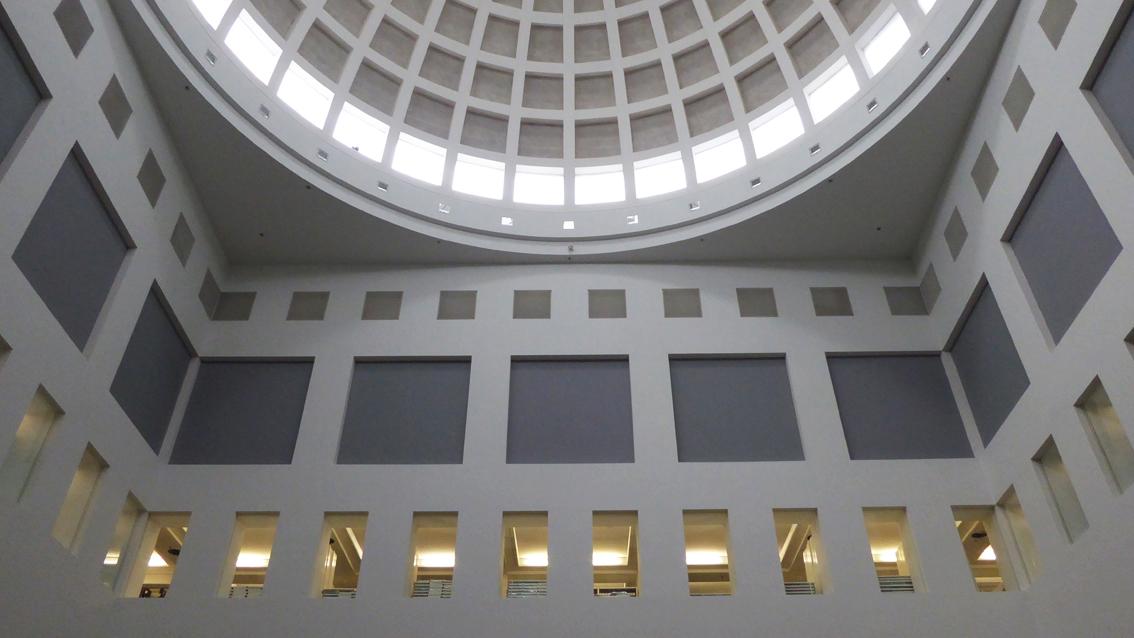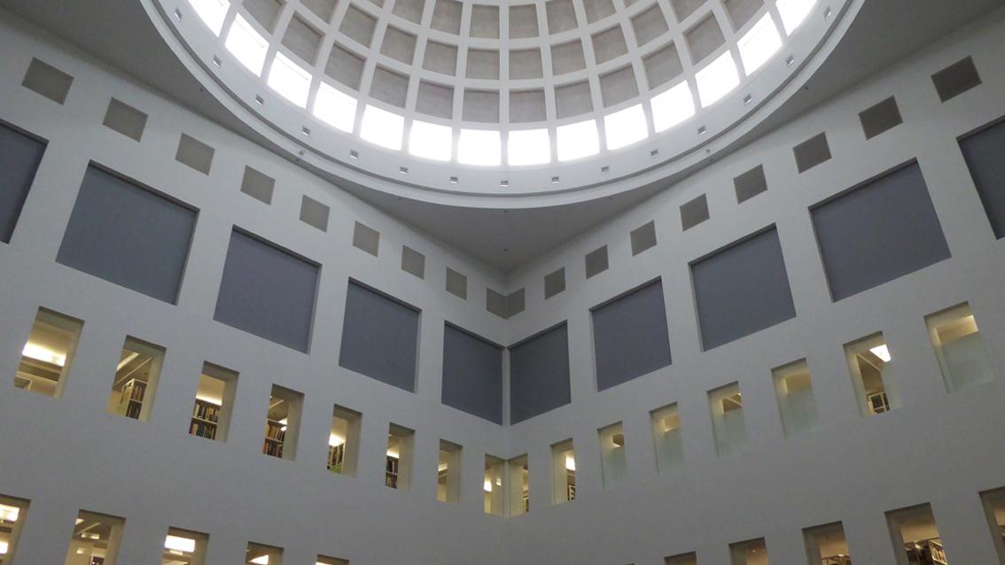 Günther Förg entwarf und verwirklichte Im Jahre 1991 für den Kuppelbau der Badischen Landesbibliothek im Rahmen einer Kunst und Bau Maßnahme eine mehrteilige Wandmalerei. Seine künstlerische Intervention ist unspektakulär und verbindet sich zurückhaltend mit der einer klaren Grundordnung verpflichteten Architektur von Oswald Mathias Ungers. Bei genauer Betrachtung lassen sich in den Farbfeldern unterschiedliche Tönungen von Grau wahrnehmen. Günther Förg war Maler, Bildhauer und Fotokünstler. Er lehrte von 1992 bis 1999 an der Hochschule für Gestaltung in Karlsruhe. Ab 1999 hatte er eine Professur für Malerei an der Akademie der Bildenden Künste in München inne. Er wurde am 5.12.1952 in Füssen geboren und verstarb am 5.12.2013 in Freiburg.