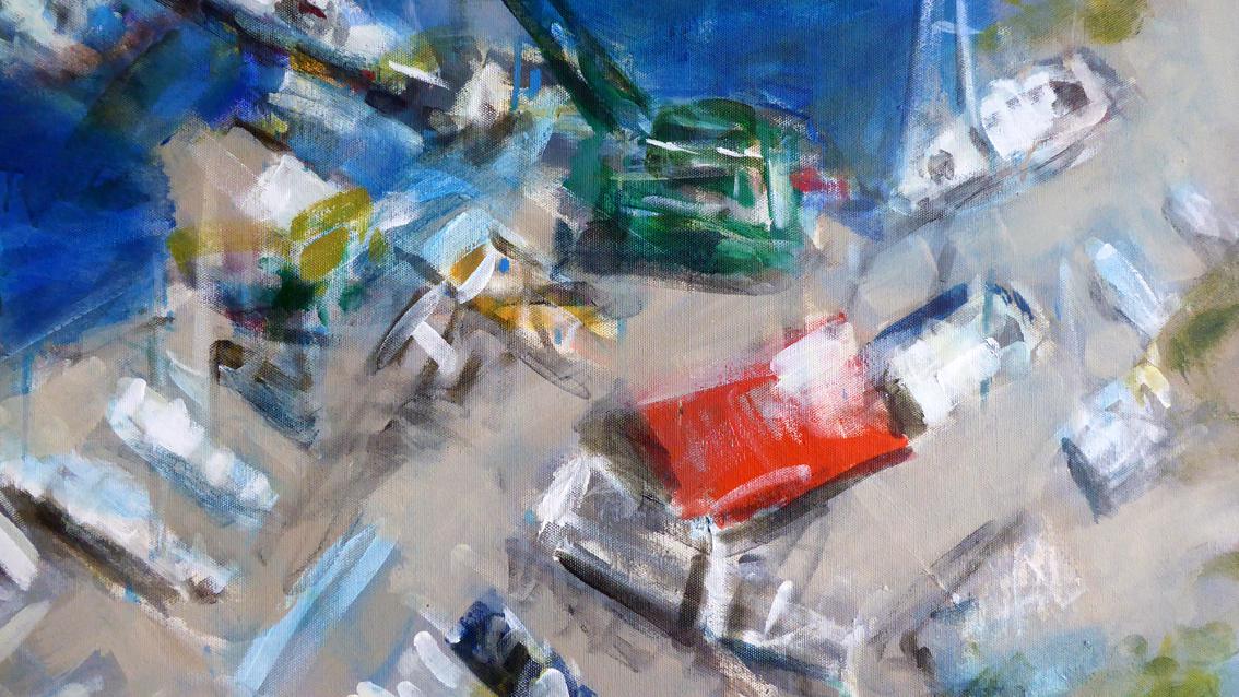 Der Karlsruher Künstler deutet eine Hafenansicht mit den Mitteln der Malerei aus der Perspektive eines Vogels. Dabei beschreibt er mit schnell und entschieden gesetzten Pinselhieben das leicht bewegte Meer und den Strandabschnitt mit den wenigen Gebäuden, dem Kran, den zahlreichen Booten und Automobilen. Während das fast zwei Drittel der Bildfläche einnehmende Meer mit Abstufungen der Farbe Blau Ruhe und Tiefe ausstrahlt, ist der Festlandteil bestimmt von Kleinteiligkeit und Mehrfarbigkeit. Das ohne Vorlage, gleichsam aus der Vorstellung eines Hafens entwickelte Bild befindet sich an einer Wand der Neurochirugie im Haus R des Klinikums. Dem Künstler wurde von den Ärzt*innen zurückgemeldet, dass dem Kunstwerk von den Patient*innen eine wohltuende Ausstrahlung zugeschrieben wird. Johannes Gervé wurde 1965 in Karlsruhe geboren und studierte von 1984 bis 1991 an der Staatlichen Akademie der Bildenden Künste Karlsruhe bei Prof. Klaus Arnold.
