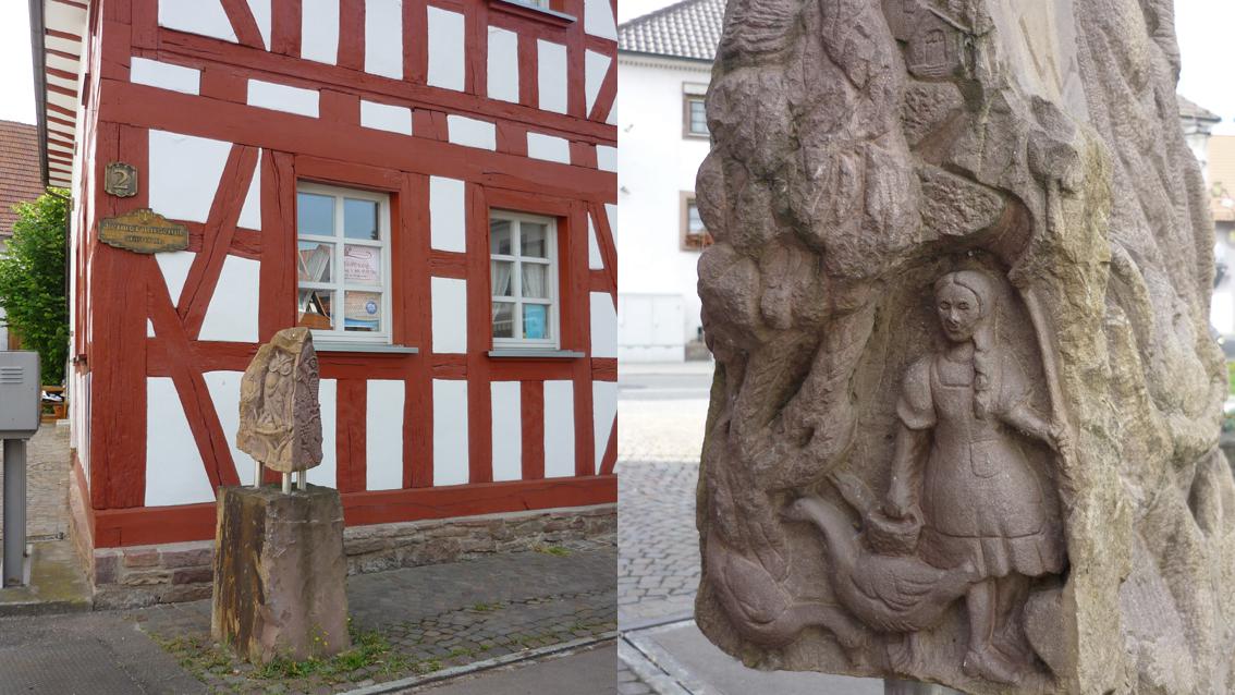Der Heimatstein des Stupfericher Bildhauers Mario Kirmayr besteht aus einem unbearbeiteten Sockel- und einem behauenen Hauptstein, drei hochglanzpolierte Edelstahlrohre verbinden sie untereinander. In einem gegenständlichen Stil arbeitete der Künstler heimatnahe Motive reliefartig heraus. Zu erkennen sind ein Mädchen mit einer Gans, Weinreben und eine Eule, die mit starrem Blick Kontakt zu den Betrachter*innnen sucht.