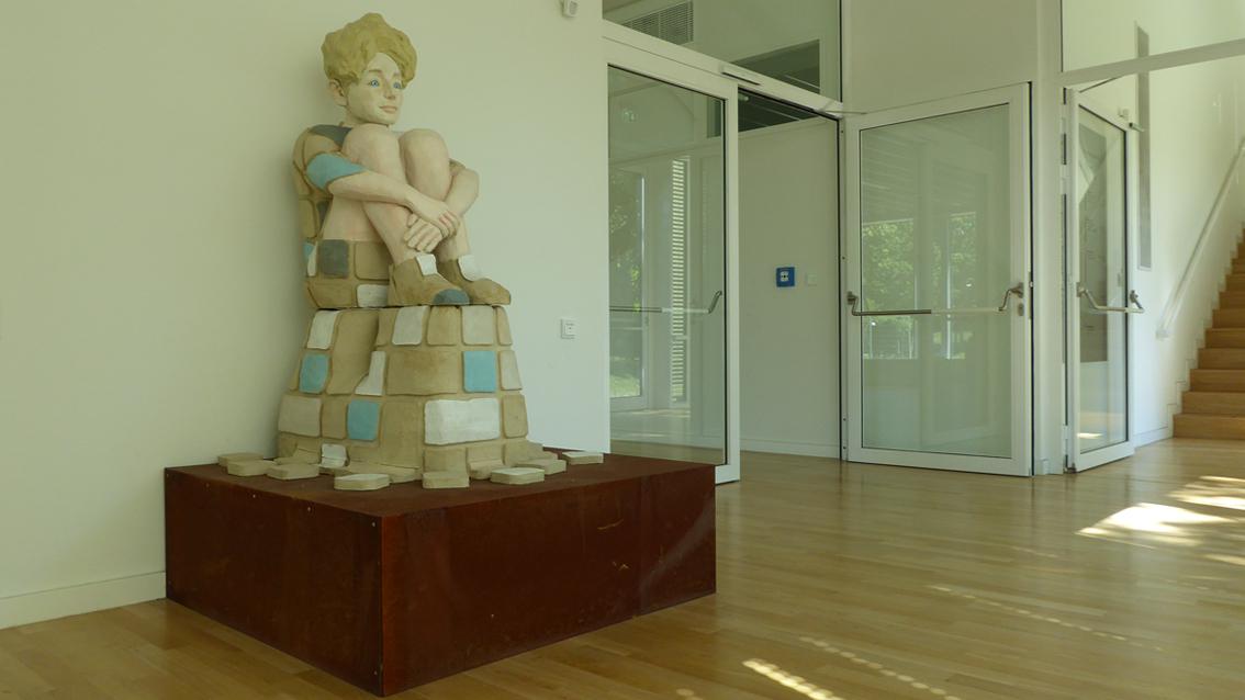 Auf einem Sockel sitzt eine androgyn wirkende Figur mit weit geöffneten Augen, die den direkten Kontakt zum Betrachter suchen. Die Körperhaltung drückt Zurückgezogenheit, der Blick dagegen Aufgeschlossenheit aus. Diesen Gegensatz verarbeitet der Künstler mit japanischen Wurzeln zu einer plastischen Form, bei der sich unterschiedlich große Tonquader, in Verbindung mit naturalistischen Ausarbeitungen, zur Plastik ‚Hopeful‘ fügen. Das Werk entstand in enger Zusammenarbeit mit der Staatlichen Majolika Manufaktur Karlsruhe. Hirofumi Fujiwara wurde 1984 in Hiroshima/Japan geboren und studierte von 2010 bis 2015 an der Staatlichen Akademie der Bildenden Künste Karlsruhe bei Prof. Stephan Balkenhol.