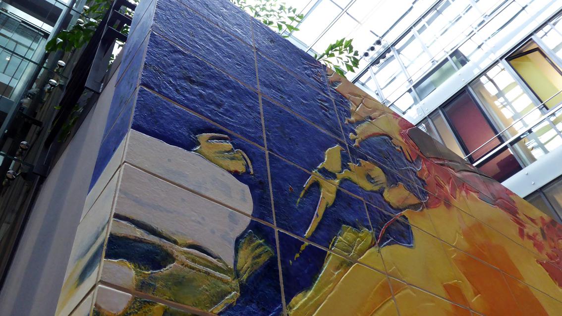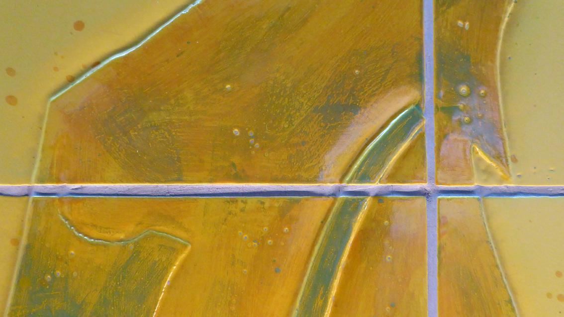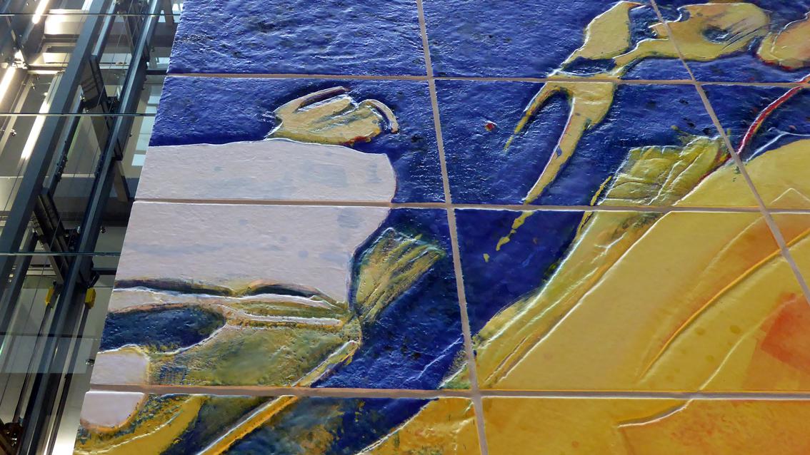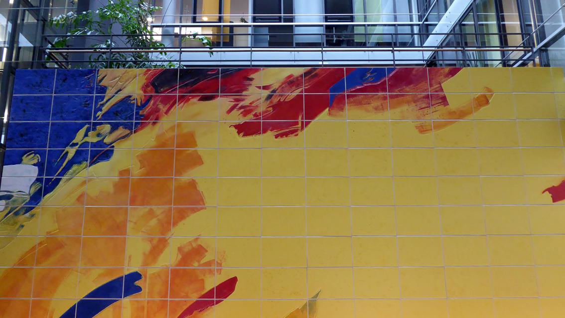 Das zweiteilige Werk der Karlsruher Keramikerin, die seit Jahren eng mit der Staatlichen Majolika Manufaktur Karlsruhe zusammenarbeitet, befindet sich am westlichen Ende des Kundenzentrums der Sparkasse Karlsruhe am Europaplatz. Die Bildsprache ist abstrakt, löst beim Betrachten allerdings gegenständliche Assoziationen aus. Die Arbeit ist bestimmt vom Klang der Grundfarben Gelb, Blau und Rot, erweitert durch Weiß und Orange. Die Geradlinigkeit des Fliesenrasters bildet einen starken Kontrast zum malerischen Duktus.