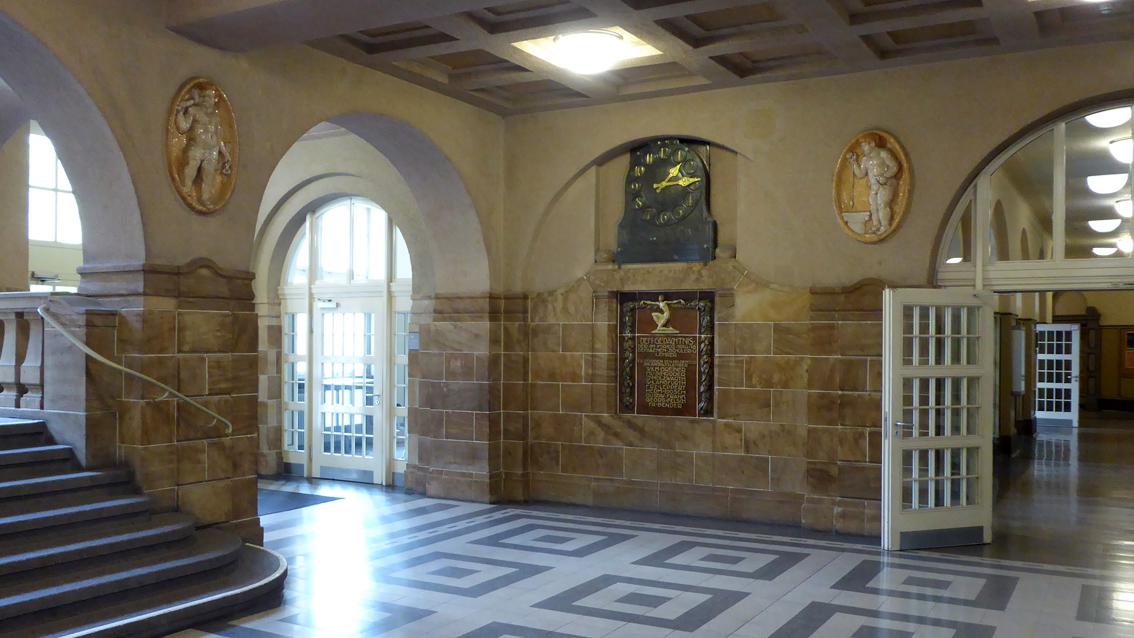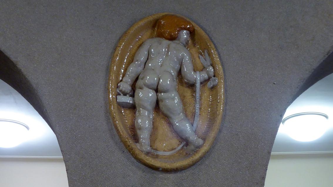 Von dem Bildhauer und Keramiker Georg Schreyögg stammen die als Reliefs auf einer ovalen Grundfläche modellierten Putten, denen die unterschiedlichsten Handwerks- und Industriesymbole zugeordnet sind. Attribute unterschiedlichster Berufe sind mutig in Beziehung zu Figuren gesetzt, die für barock anmutenden Schalk stehen. Die Folge von Putten bietet einen hellen, plastischen Gegensatz zu den dunkel gehaltenen Malereien auf den flachen Wänden von Alfred Böld in der direkten Nachbarschaft. Zwischen 1909 und 1912 arbeitete der aus Bayern stammende Künstler eng mit der Staatlichen Majolika Manufaktur Karlsruhe zusammen. Möglicherweise mündete die Kooperation in den umfassenden Auftrag für die damalige Gewerbeschule. Neben der Serie der 'Putten' gestaltete der Plastiker im Schulgebäude auch zwei schlichte Brunnen. Von 1920 bis 1932 war Georg Schreyögg Professor für Bildhauerei an der Landeskunstschule in Karlsruhe. Er verstarb 1934 in München.