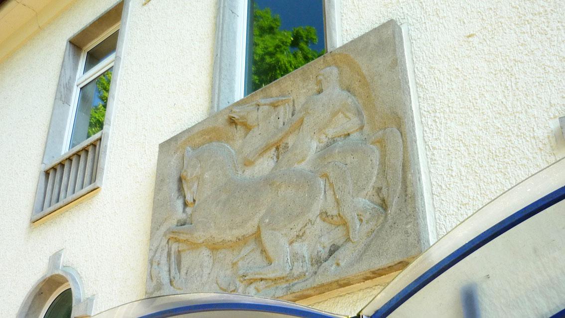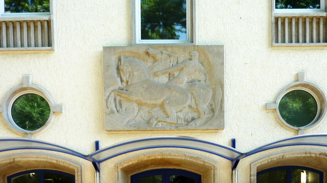Das Relief des wegen seiner Haltung zum Nationalsozialismus umstrittenen Künstlers entstand zur gleichen Zeit wie sein ‚Kämpfer mit Schwert und Schild‘, der sich in direkter Nachbarschaft befindet. Die architekturbezogene Wandarbeit zeigt einen nackten Reiter auf einem ungesattelten Pferd. Die Gruppe wird vervollständigt durch ein weiteres Ross im Vordergrund. Im Gegensatz zum ‚Kämpfer‘ ist das Relief nicht eindeutig als ‚Nazikunst‘ zu werten. Dennoch sind typische Merkmale zu erkennen, wie die heroische Pose und die formale Übertreibung bei der Darstellung von Mensch und Tier.