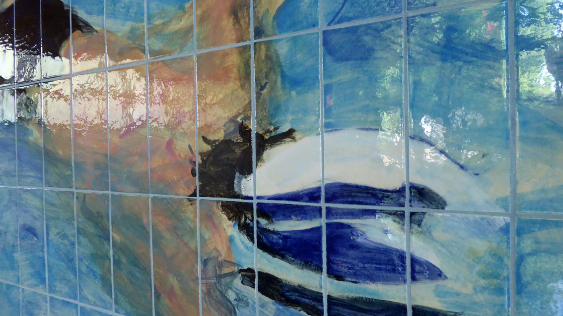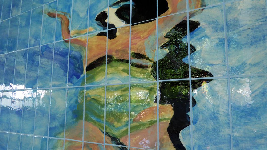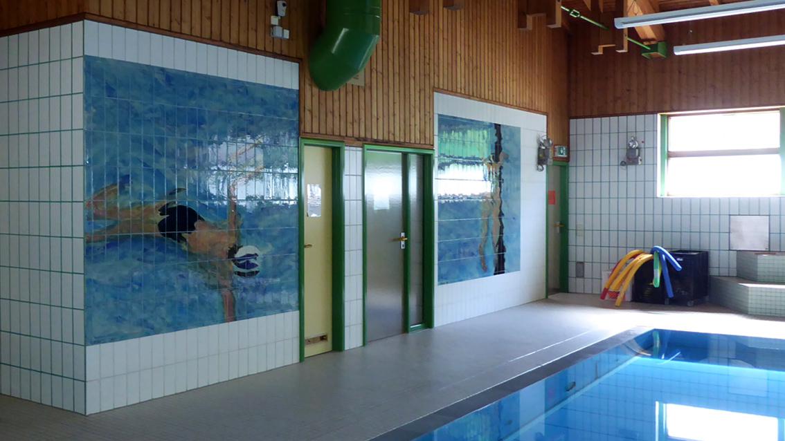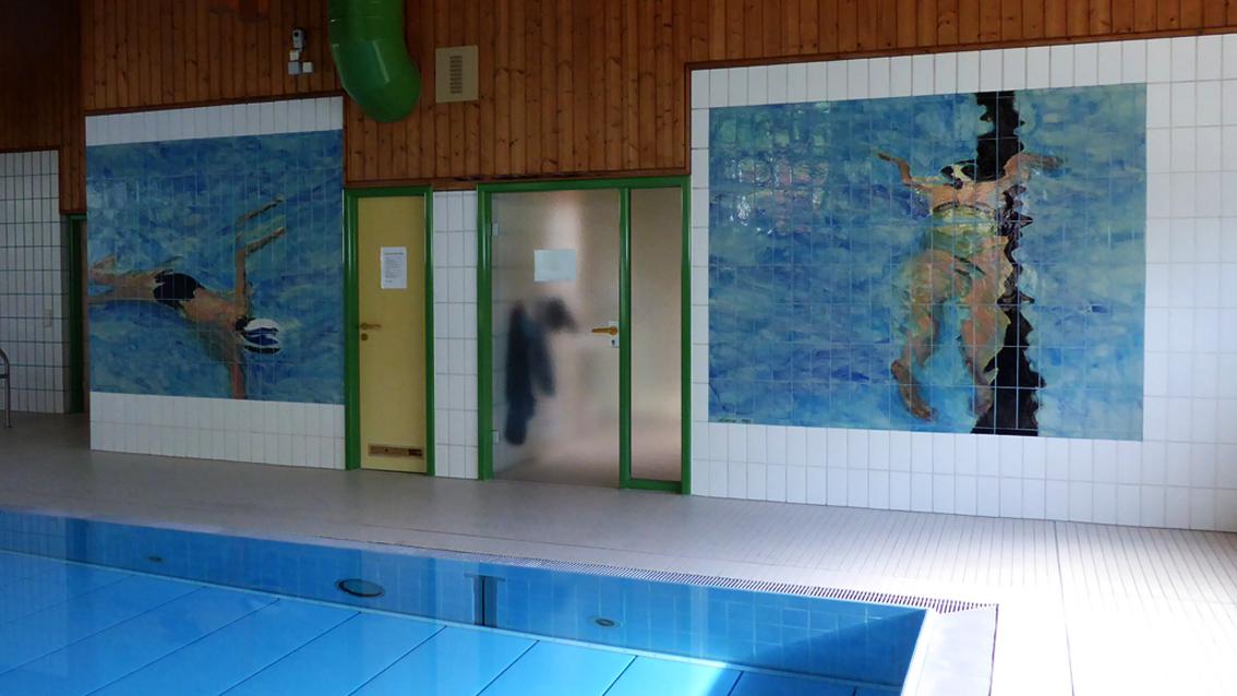 Im Schwimmbad der Albschule befinden sich zwei Arbeiten des Karlsruher Malers Helmut Wetter, die in Zusammenarbeit mit der Staatlichen Majolika Manufaktur Karlsruhe entstanden. Gebrannte und glasierte Kacheln fügen sich zu großformatigen Deutungen einer Schwimmerin und eines Schwimmers. Mit einem gestischen Malduktus hält der auch als Musiker bekannte Künstler Mann und Frau fest, wie sie sich durch das angenehme, kühle Nass bewegen. Die Werke zeigen viele Farbabstufungen, die von unterschiedlichen Blautönen (Wasser) über Türkis (Badeanzug) und Ockerrosa (Hautfarbe) bis zu einem dunklen Grau (Bahnmarkierung) reichen. Die Wirklichkeit ist genau beobachtet und wird zugleich verwandelt. Figur und Grund lösen sich im Wasser auf und verschmelzen zu einer künstlerischen Einheit.