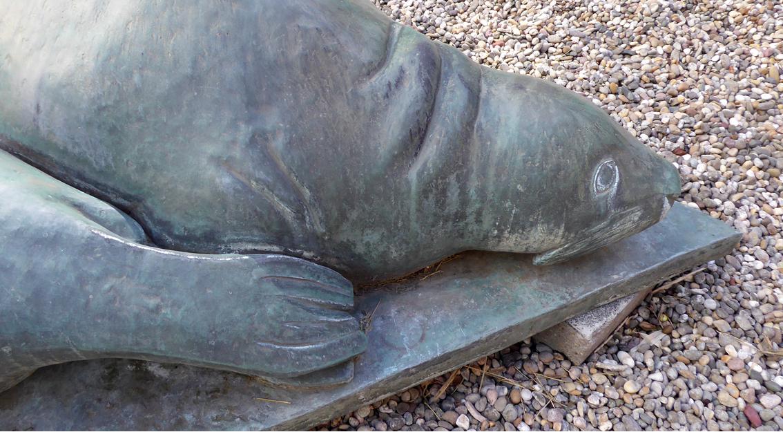 Hans Graef war Bildhauer und Lyriker. Er wurde 1909 in Freiburg geboren und starb ebenda im Jahre 1963. Er studierte Bildhauerei bei Christoph Voll an der Landeskunstschule, der Vorläufereinrichtung der Staatlichen Akademie der Bildenden Künste Karlsruhe. Das Seelöwenpaar, das sich heute im Innenhof der Agentur für Arbeit in der Brauerstraße befindet, zitiert die Formensprache der Bildhauerei der 50er Jahre des letzten Jahrhunderts: Die Wirklichkeit erscheint vereinfacht und leicht abstrahiert dargestellt.