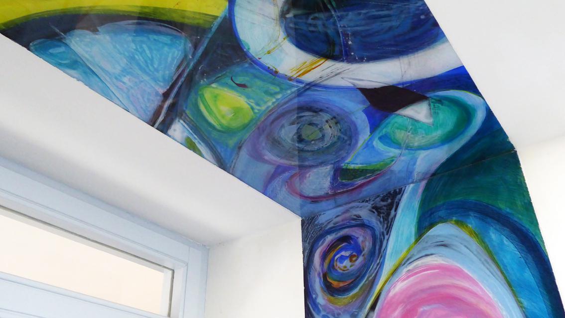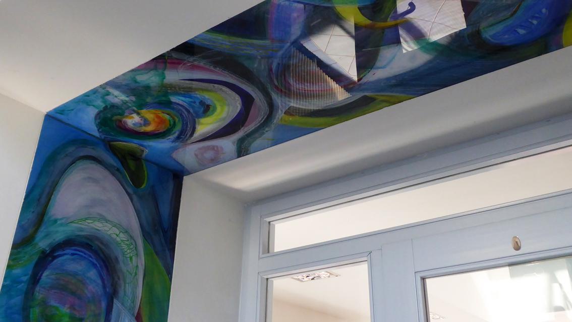 Im Jahre 1992 gestaltete der in Durlach ansässige Künstler, der weit über die Region hinaus bekannt ist, den Eingangsbereich der Kindertagesstätte am Weinbrennerplatz. Ein ca. 50 cm breiter und ca. 7 m langer Streifen aus Glas, das von hinten bemalt ist, bildet ein Tor, das die Kinder der Einrichtung mit den Farben des Spektrums empfängt. Die Farben sind in einem gestischen Duktus deckend bis transparent aufgetragen. Über Ballungen, Streuungen und Wirbel entsteht eine Farbdynamik, die für Lebendigkeit und Lebensfreude steht. Norbert Huwer studierte zwischen 1967 und 1973 Malerei und Bildhauerei an der Staatlichen Akademie der Bildenden Künste Karlsruhe bei Prof. Klaus Arnold und Prof. Wilhelm Loth. Er wurde am 13. Juli 1947 in Homburg/Saar geboren und verstarb am 4. November 2019 in Karlsruhe.