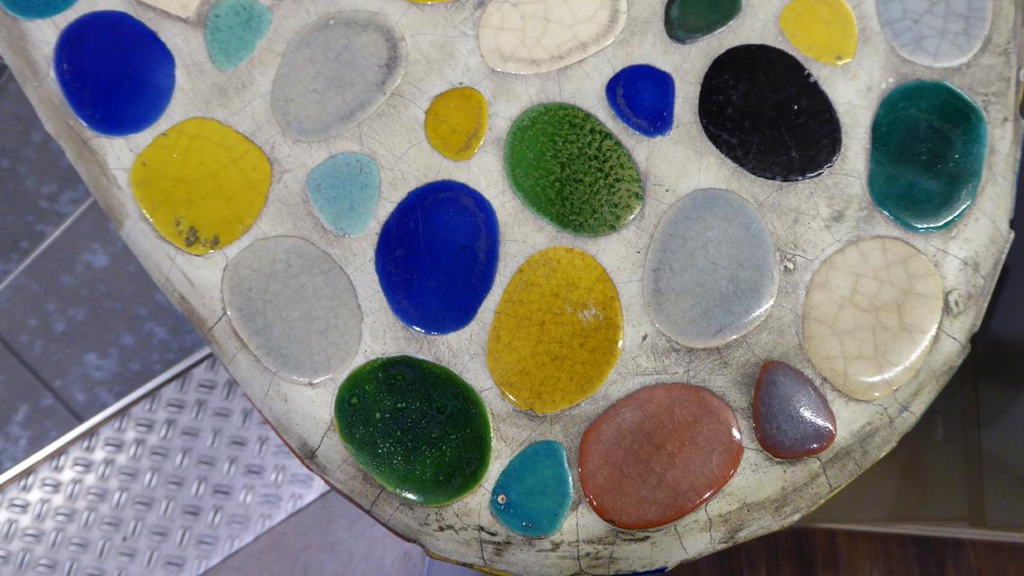 Der Weg zur CD- und Schallplattenabteilung des Musikhauses Schlaile führt über eine Treppe entlang einer hohen Wand. Auf dieser sind in unterschiedlichen Abständen Vögel und Schmetterlinge angebracht, die sich in den verschiedensten Farben und Formen vom weißen Hintergrund kontrastreich abheben. Im Zentrum der Installation steht ein großer Phantasievogel in Türkisblau, der nach einem Schmetterling in Gelb und Blauviolett schnappt. Die Gestaltung, die unten figürlich beginnt und oben abstrakt endet, verantwortete eine Gruppe von Keramiker*innen der Staatlichen Majolika Manufaktur Karlsruhe. Die Arbeit wurde 1955 beauftragt und im Jahre 1970 erweitert.
