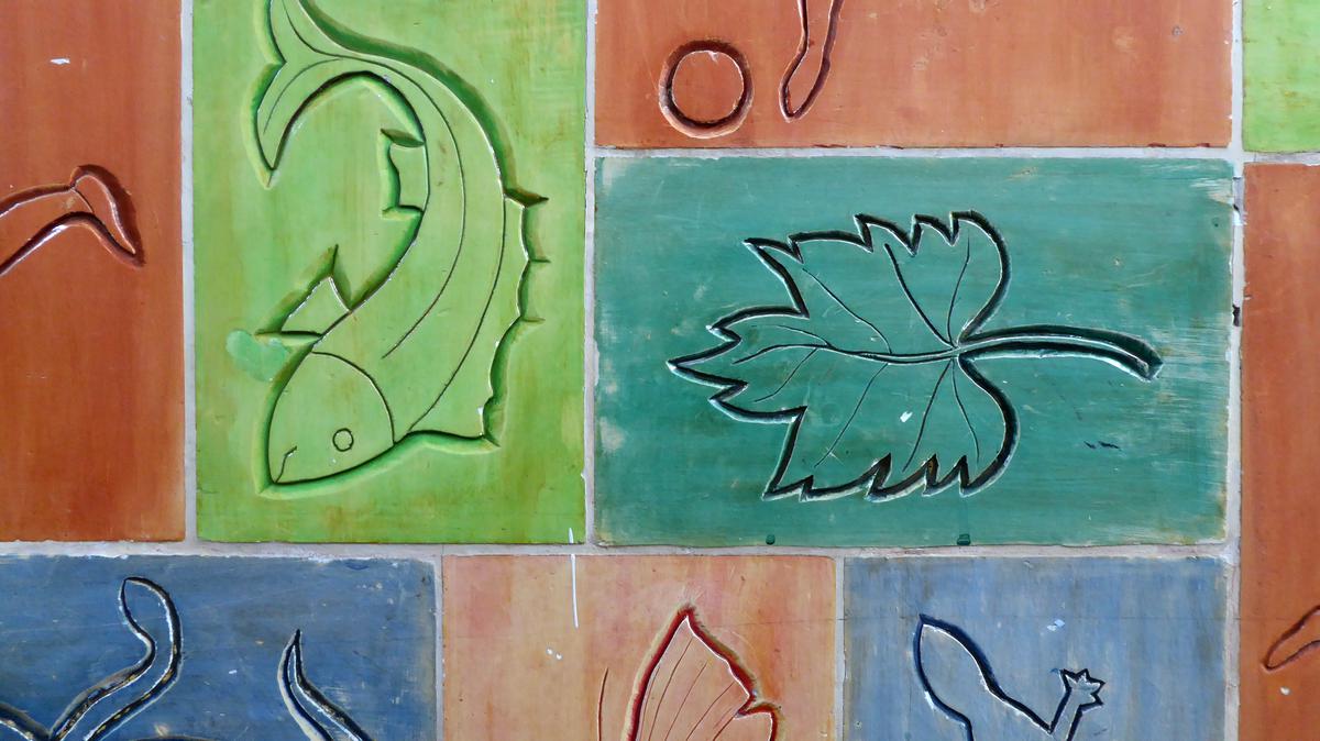 An einer Innenwand der Sporthalle der Draisschule befindet sich ein Wandbild, das aus mehreren Reihen unterschiedlich großer, gebrannter und glasierter Kacheln besteht. Es dominieren die Grundfarben. Auf den roten Flächen sind als einfache Linienzeichnung Jungen und Mädchen bei der Ausführung verschiedener Sportarten zu sehen. Die blauen und blaugrünen Kacheln zeigen abstrahierte Motive aus der Pflanzen- und Tierwelt, die gelben Fliesen bleiben unbearbeitet. Es ist anzunehmen, dass das Wandbild im Rahmen einer schulischen Veranstaltung mit Schülerinnen und Schülern entstand, unter der Leitung einer oder eines B. Wuorz.