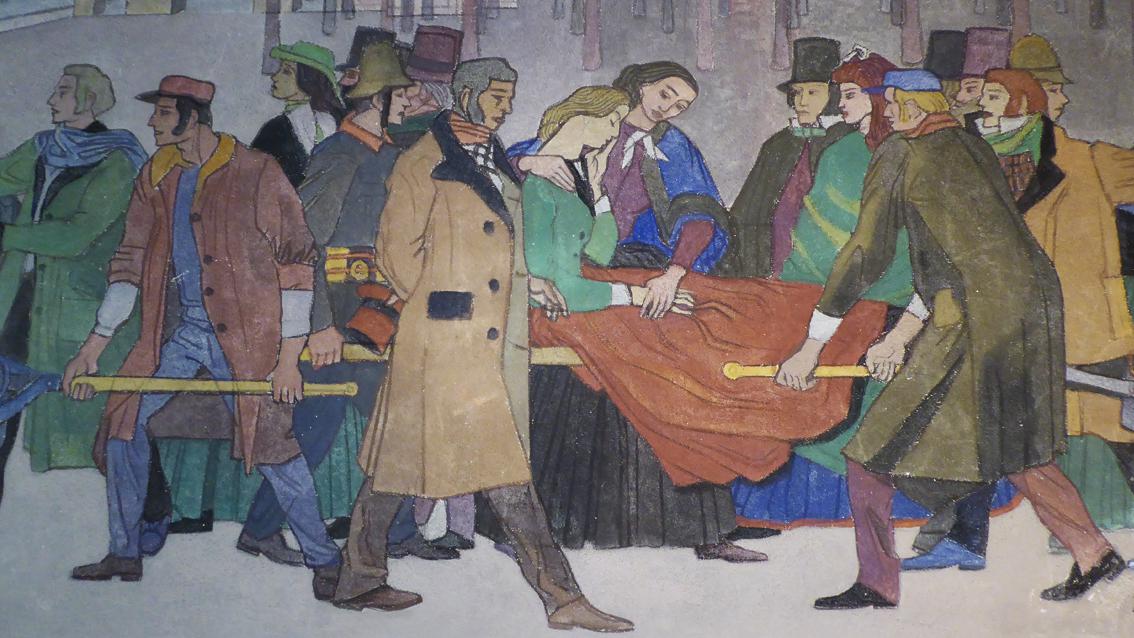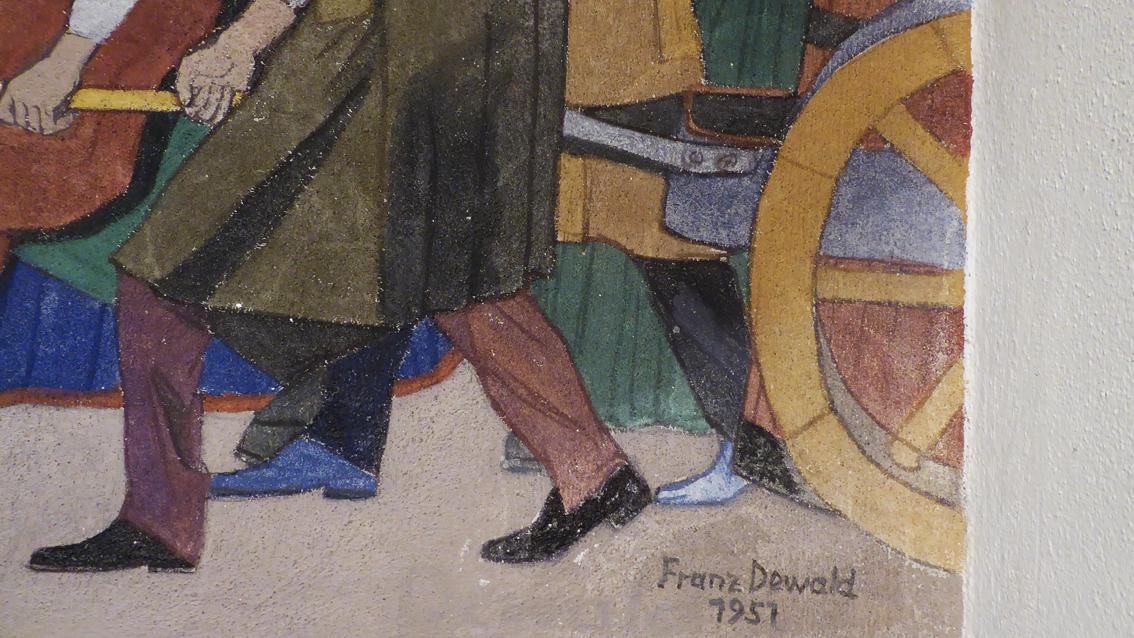 Ab 1938 studierte Dewald an die Badischen Landeskunstschule, einer Vorläufereinrichtung der Staatlichen Akademie der Bildenden Künste Karlsruhe. Während des Krieges hielt er sich als technischer Zeichner für das Militär in Paris auf. Dort kam er in Kontakt mit der Klassischen Moderne. Zwischen 1949 und 1989 führte Dewald zahlreiche öffentliche Aufträge in Form von Wand- und Glasmalereien, Bronzereliefs sowie Betonplastiken aus. Die Wandmalerei im Aufenthaltsraum der Freiwilligen Feuerwehr Karlsruhe Abt. Grötzingen entstand im Jahre 1957. Sie zeigt den Brand des Karlsruher Hoftheaters im Jahre 1847 und den couragierten Einsatz der ‚Freiwilligen Feuerwehr‘ aus Durlach in einer ca. 15 m breiten und ca. 130 cm hohen Bildfolge. Die Durlacher Feuerwehr wurde 1846 durch den Stadtbaumeister Christian Hengst und dem Spritzen-Fabrikanten Carl Metz gegründet.