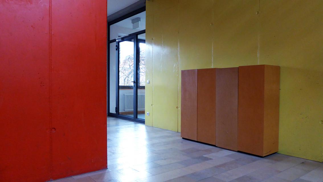 Der Künstler wurde 1950 in Karlsruhe geboren und studierte in den 70er Jahren des letzten Jahrhunderts an der Staatlichen Akademie der Bildenden Künste Stuttgart. Er ist durch irritierende Fotokunst, farbstarke Interventionen im öffentlichen Raum und Kooperationen mit international renommierten Architekten weit über die Region hinaus bekannt. Funktionale Eigenschaften von Bauwerken betont Harald F. Müller durch subtile, farbige Eingriffe. Im Treppenhaus des Anbaus des Helmholtz-Gymnasiums sind die bestimmenden Farben Rot, Gelb und Grün. Sie sind so untereinander und mit der Architektur in Beziehung gesetzt, dass die Passierenden stetig sich wandelnde Räume unterschiedlicher Farbintensität durchschreiten. Die blauen Spinte, die abgestellten Gegenstände und der sandfarbene Sockel, werden in Verbindung mit den künstlerischen Farbsetzungen zu selbstverständlichen Bestandteilen einer umfassenden Inszenierung von Raum mit Farbe.
