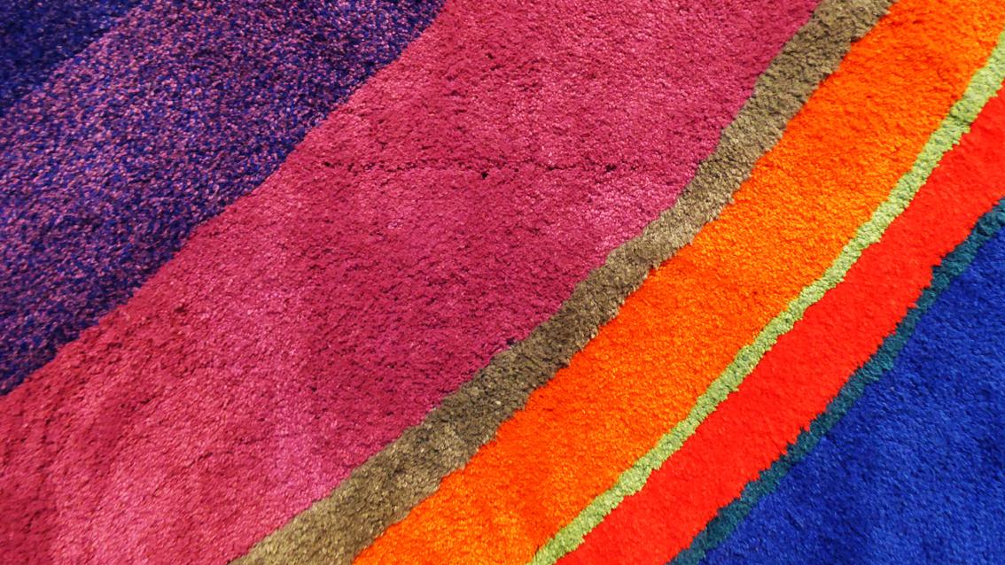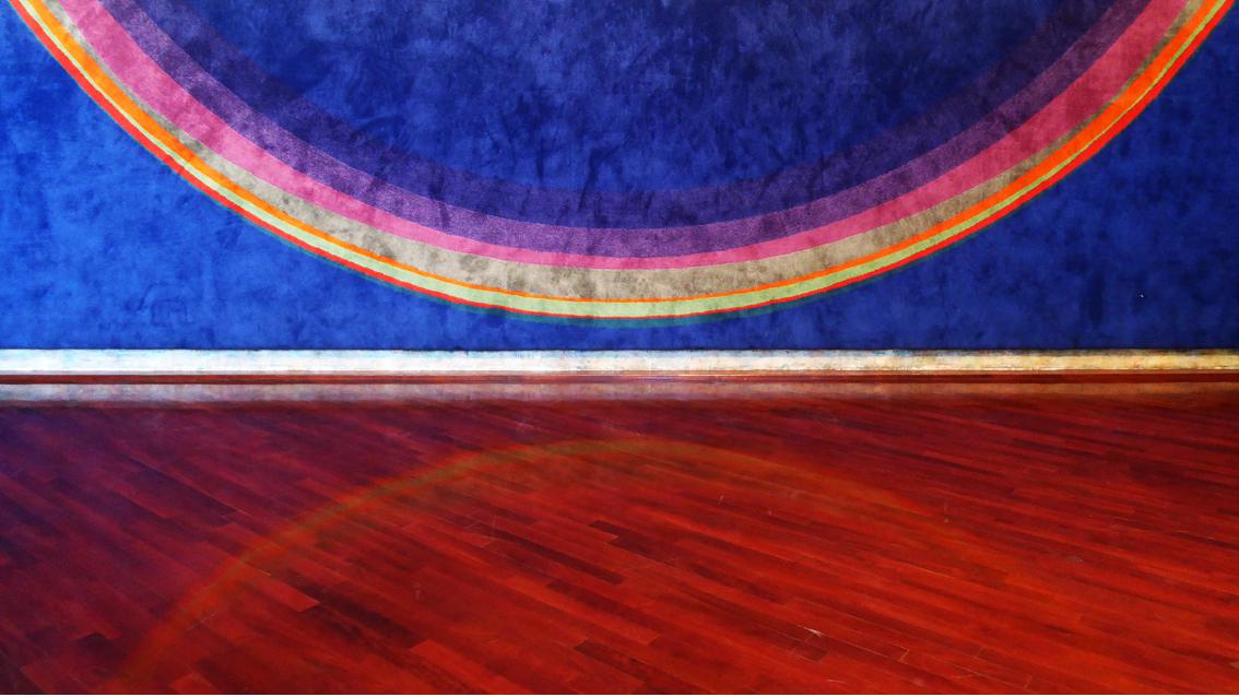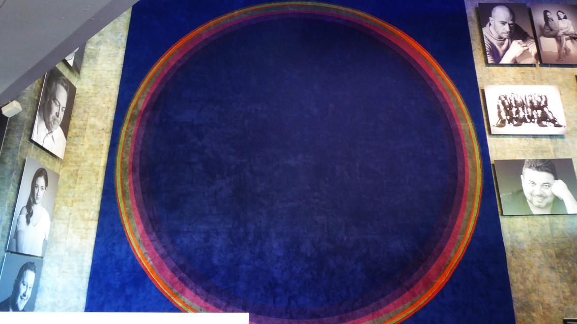 Der großformatige Wandteppich von Lothar Quinte ist ein leuchtendes, großformatiges Zeichen, das die Besucher*innen magisch anzieht. Eine materialbedingt leicht changierende, monochrom blauviolette quadratische Fläche bildet in Verbindung mit stark farbigen Ringen ein Kunstwerk, das gleichermaßen Energie bündelt und ausstrahlt. Sogar die Bodenfläche vor der Arbeit erscheint farbig aufgeladen. Das Kunstwerk im Badischen Staatstheater gilt als eines der Hauptwerke des Künstlers. Ein weiterer Kunst am Bau Beitrag von Lothar Quinte vor Ort ist das sogenannte ‚Spaltbild‘ auf dem eisernen Vorhang der Theaterbühne. Der Künstler ist weit über die Region hinaus bekannt und zugleich eng mit Karlsruhe verbunden. Arbeiten von ihm befinden sich in der Städtischen Galerie Karlsruhe, in der Staatlichen Kunsthalle Karlsruhe sowie bei vielen privaten Sammler*innen. Lothar Quinte starb am 29.Juli 2000 in Wintzenbach, einer grenznahen elsässischen Gemeinde, in der er seit den 60er Jahren des letzten Jahrhunderts lebte und arbeitete. Dort wurde der Platz vor der Kirche ab 2002 nach ihm benannt.