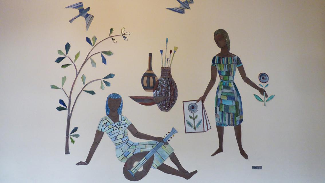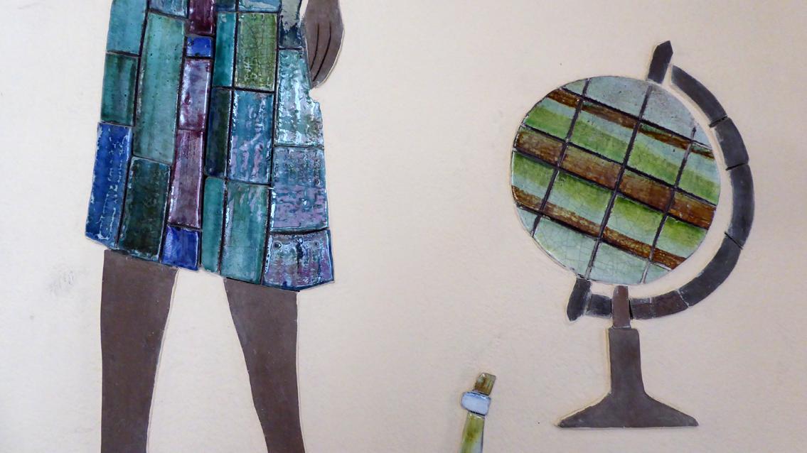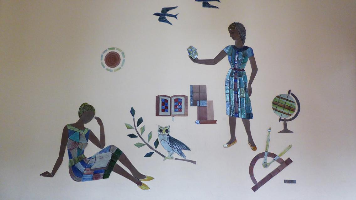 Hinter dem Haupteingang des Schulgebäudes befinden sich links und rechts zwei gut erhaltene Reliefs aus den 50er Jahren des letzten Jahrhunderts. Sie wurden in der Staatlichen Majolika Manufaktur Karlsruhe hergestellt und 1957/58 im Fichte Gymnasium installiert. Der Künstler bzw. die Künstlerin ist unbekannt, möglicherweise verweisen die Kürzel UJ am unteren Bildrand auf die Autorenschaft. Bei einem Werk werden dem Mädchenpaar Malpinsel oder Musikinstrumente zugeordnet, die auf die Bedeutung musischer Fächer verweisen. Bei dem anderen Relief sind es Buch, Globus und Zirkel, welche die Bedeutung geistes- und naturwissenschaftlicher Fächer unterstreichen. Figuren, Gegenstände und Umgebung sind in einem abstrahierenden Naturalismus wiedergegeben, wie es typisch war für die Nachkriegsjahre. Auffallend ist der bewusste Einsatz von naturbelassenem und glasiertem Ton, wodurch spannungsvolle Oberflächenkontraste entstehen.