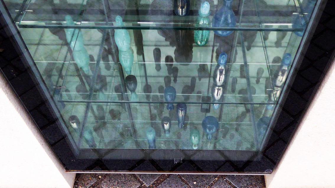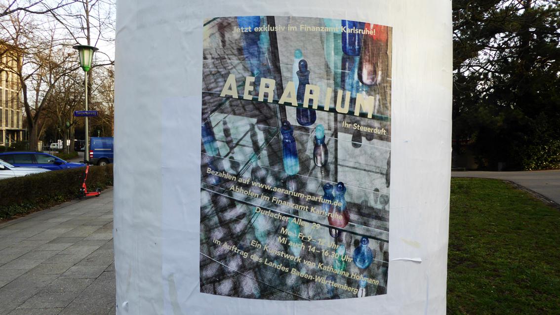 AERARIUM ging als Siegerarbeit aus einem eingeladenen Kunst-am-Bau Wettbewerb für den Neubau des Karlsruher Finanzamtes hervor. Die Tatsache, dass sich auf dem Neubaugelände ehemals die Parfümerie F. Wolff und Sohn befand sowie der Fund eines grünen, waldgläsernen Parfümflakons aus der frühen Neuzeit nahe Karlsruhe, inspirierte die Konzeptkünstlerin, ein Duftwasser entwickeln zu lassen, das nach frisch gedrucktem Geld riecht. Das Parfüm wurde in 600 Flakons abgefüllt, entworfen von der Künstlerin und produziert in der Wolfacher Dorotheenhütte. Präsentiert in einer Glasvitrine neben dem Haupteingang, warten die individuell gestalteten Glasbehälter mit dem ‚(S)teuerduft‘ auf kunstinteressierte und solvente Käufer*innen. Die Flakonpräsentation vor Ort wird durch flankierende Maßnahmen beworben. Die Künstlerin schreibt dazu in ihrem Konzept: „…Und eine Kampagne wirbt mittels Zeitungsanzeigen und Plakaten Im Stadtzentrum: AEARIUM – Ihr Steuerduft! Jetzt exklusiv im Finanzamt Karlsruhe!“. Katharina Hohmann studierte bis 1991 an der Hochschule der Künste in Berlin. Verschiedene Auslandsstipendien führten sie nach Marseille, Rom und Istanbul. Zwischen 1999 und 2005 arbeitete sie als künstlerische Mitarbeiterin an der Bauhaus Universität in Weimar. Seit 2007 lehrt sie an der Haute École d’Art et de Design in Genf. Sie lebt in Genf und Berlin.