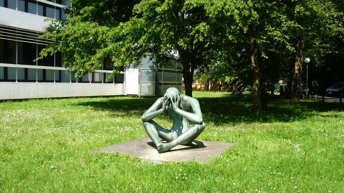 In sich versunken und unbekleidet, ruht der bronzene Denker des Berliner Bildhauers und Träger des Georg-Kolbe-Preises bodennah auf einer einfachen Plinthe. Deutlich sind in Inhalt und Form die 60er Jahre des letzten Jahrhunderts gegenwärtig. Die Formensprache ist gegenständlich mit einer Tendenz zur Vereinfachung. Die Konzentration auf das Wesentliche und der symmetrische Aufbau verleihen der Plastik einen zeichenhaften Charakter.