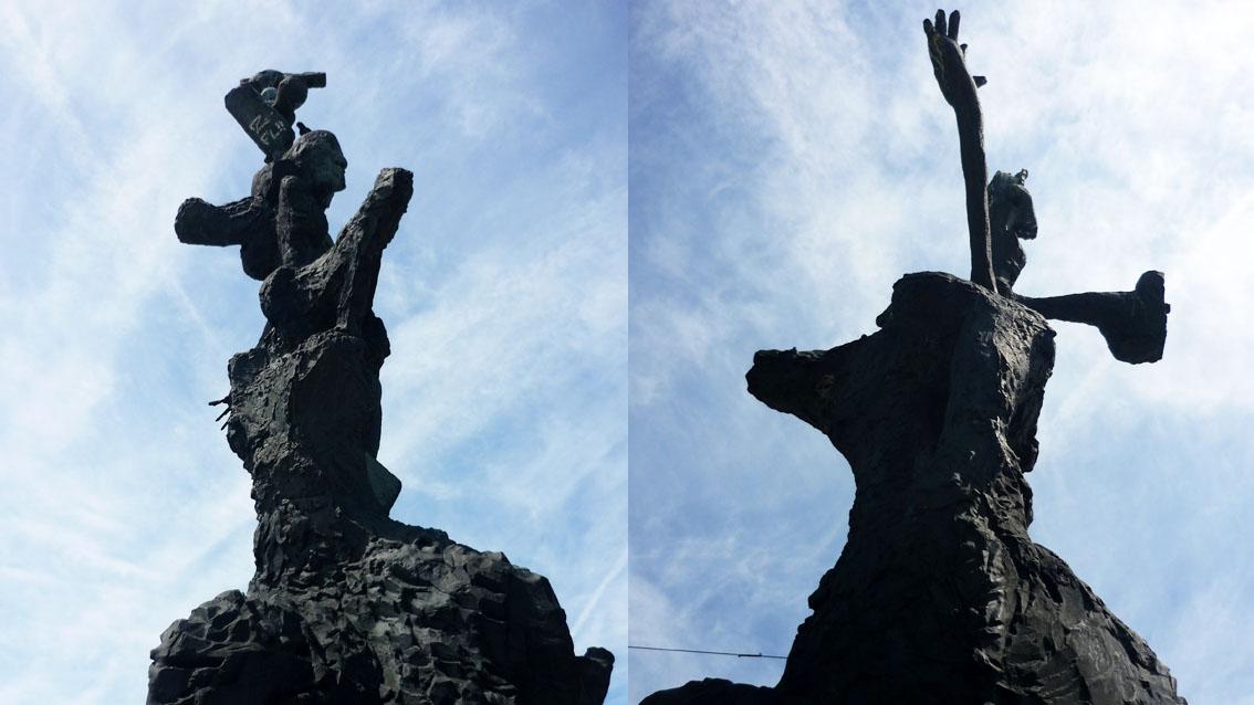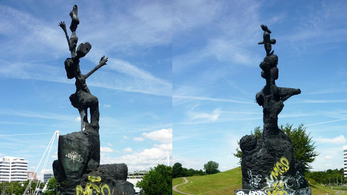 Markus Lüpertz lehrte zwischen 1973 und 1986 an der Staatlichen Akademie der Bildenden Künste in Karlsruhe. In erster Linie als Maler bekannt, schuf er ab etwa 1980 immer wieder bildhauerische Arbeiten. Gegossen in Bronze und versehen mit einer sehr dunklen Patina, erschrickt, provoziert und erheitert die plastische Gruppe in Form und Inhalt die per Bahn, Rad oder zu Fuß Passierenden.