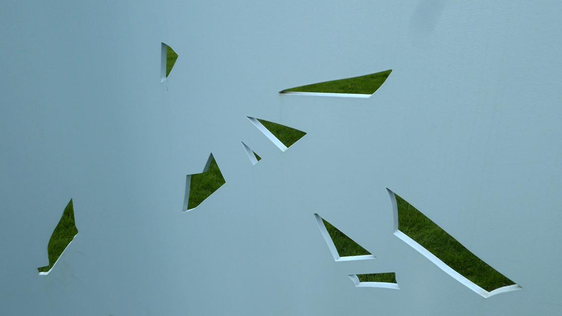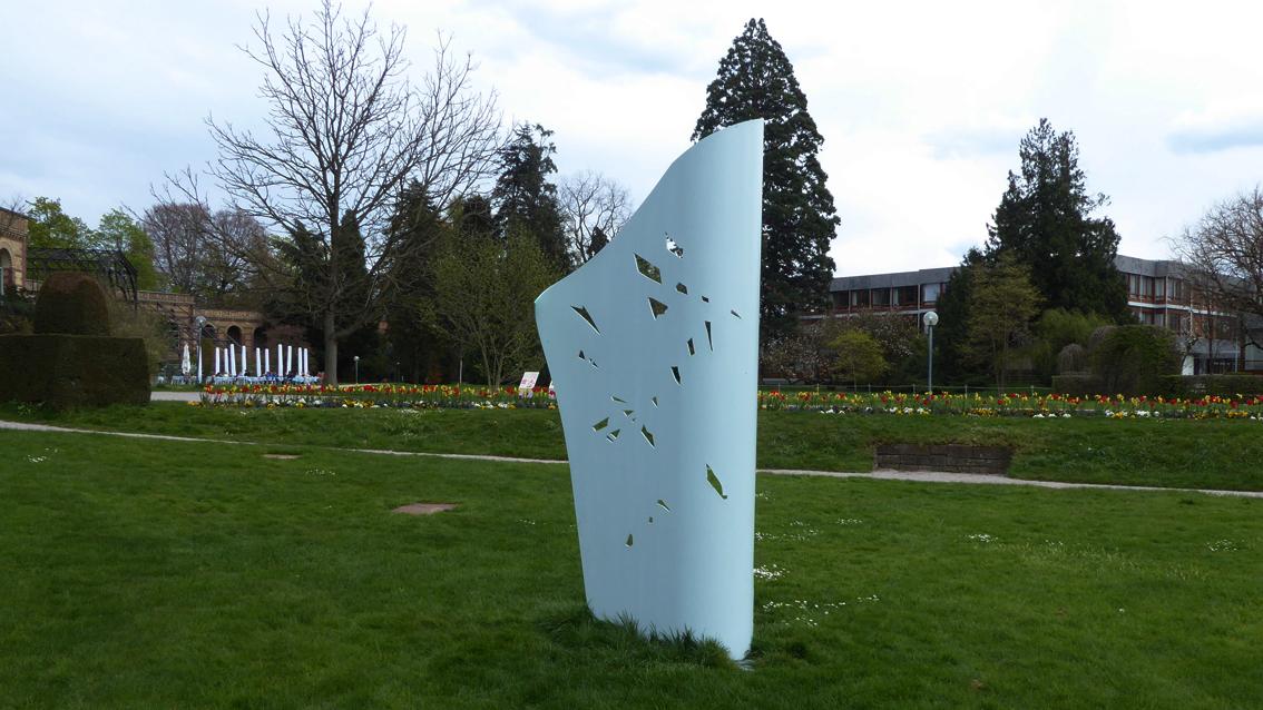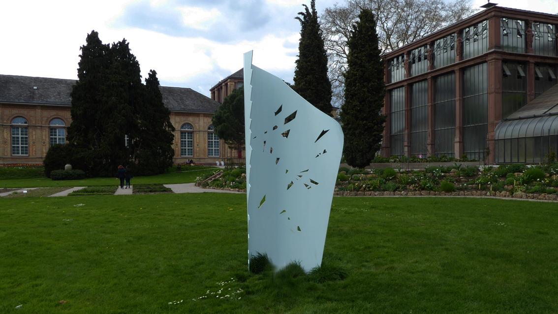 Die Plastik wurde im Rahmen der Ausstellung ‚Retour de Paris‘ der Stiftung Centre Culturel Franco-Allemand Karlsruhe im Jahre 2022 im Botanischen Garten aufgestellt. Der deutsch-französische Titel würdigt möglicherweise den lebhaften Kulturaustausch zwischen den beiden Ländern. Mitten auf einer Wiesenfläche installiert, lädt das Kunstwerk die BetrachterInnen dazu ein, es zu umgehen. Der Wechsel von Tageslicht, Standort, Nähe und Distanz erzeugt kontinuierlich neue Ansichten. Dabei stellt die farbig gefasste und mit Durchblicken versehene Edelstahlarbeit stetig sich wandelnde Bezüge her zur Architektur und Gartengestaltung sowie zum Blau des Himmels. Nina Laaf wurde im Jahre 1977 in Hilden geboren. Sie erhielt mehrere Auszeichnungen und Stipendien, so im Jahre 2019 einen mehrmonatigen Aufenthalt an der Cité Internationale des Arts in Paris.