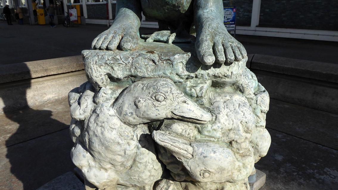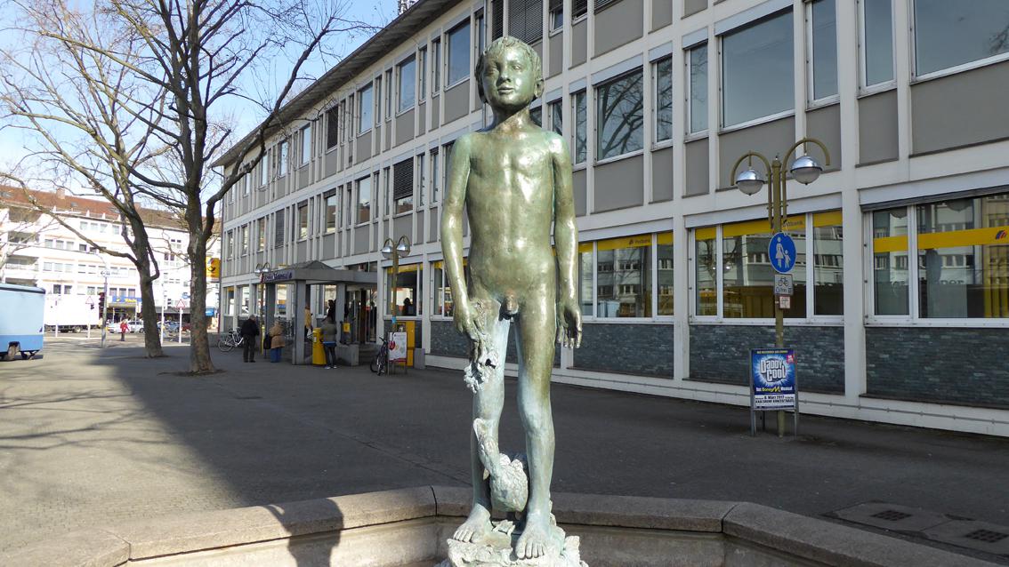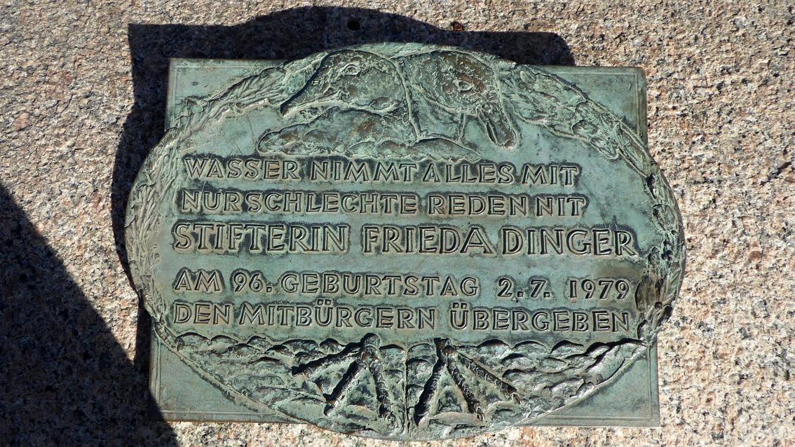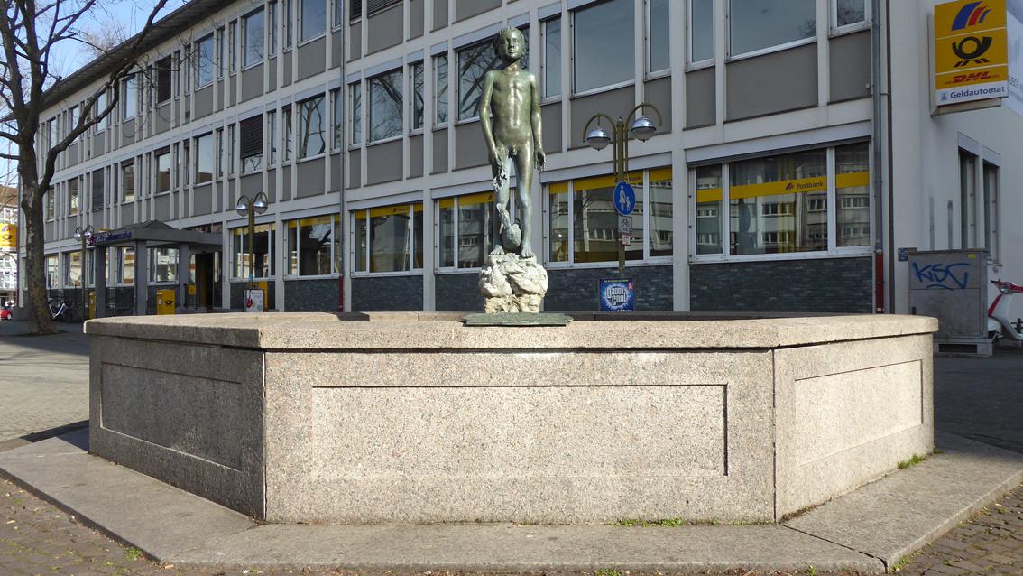 Der Künstler lehrte zwischen 1957 und 1976 an der Staatlichen Akademie der Bildenden Künste Karlsruhe Bildhauerei. Unter anderen studierte Voré bei ihm, der am Skulpturenpfad Wettersbach mit einer Installation aus Natursteinelementen vertreten ist. Hans Kindermann ist bekannt für seinen naturnahen, einfühlsamen Figurenstil. Im Zentrum der Brunnenanlage befindet sich eine nackte Knabengestalt auf einem Sockel mit Entenreliefs. Eine vollplastisch gestaltete Ente vermittelt zwischen Sockel und Kind. Auf der Inschrift steht: WASSER NIMMT ALLES MIT, NUR SCHLECHTE REDEN NIT - STIFTERIN FRIEDA DINGER 2.7.1979 AM 96.GEBURTSTAG DEN MITBÜRGERN ÜBERGEBEN.