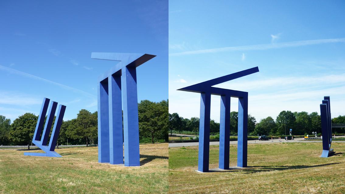 Mit dem Material Stahl und in der Farbe Blau deutet der Künstler in einer einfachen und klaren Formensprache das von Friedrich Weinbrenner im Jahre 1803 entworfene Stadttor neu. Andreas Helmling studierte Bildhauerei an der Staatlichen Akademie der Bildenden Künste Karlsruhe. Im Jahre 1988 wurde er Meisterschüler von Prof. Otto Herbert Hajek, der die Skulptur 'Stadtzeichen' auf dem Bahnhofsvorplatz schuf. Seit 2011 befindet sich das monumentale Werk wegen der Untertunnelung der Kriegsstrasse auf einem Wiesengrundstück am Schwarzwaldkreuz. Aufgrund ihrer 'Insellage' ist die Plastik nicht aus der Nähe wahrnehmbar. Die Ettlinger Allee auf der Westseite entlang flanierend, hat man allerdings von der Schwarzwaldbrücke aus einen guten und freien Blick auf das Kunstwerk. Der Künstler verstarb am 19. August 2019 nach schwerer Krankheit.