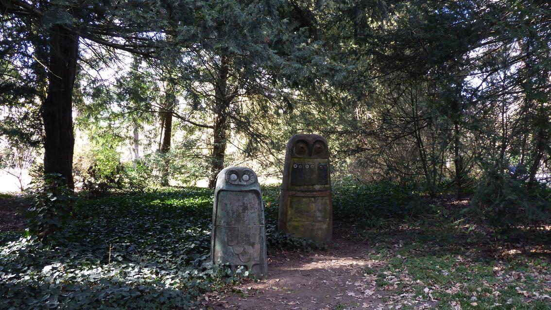 Das plastische Ensemble von Eva Fritz-Lindner besteht aus acht Eulen unterschiedlicher Höhe, Breite und Tiefe, verteilt über eine Rasenfläche nahe dem Botanischen Garten. Mit unterschiedlichen Ausdrucksformen und in einer eher zurückgenommenen, naturnahen Farbigkeit treten die Eulen in Kontakt mit den vorbei Flanierenden. Die Gruppe wurde anlässlich der Bundesgartenschau im Jahre 1967 im Schlosspark aufgestellt. Über Jahre arbeitete die Keramikerin eng mit der Staatlichen Majolika Manufaktur Karlsruhe zusammen. Eva Fritz-Lindner wurde am 17.März 1933 in Düsseldorf geboren und studierte an den Werkkunstschulen Wiesbaden und Darmstadt. Sie verstarb am 2.Juli 2017 in Karlsruhe.