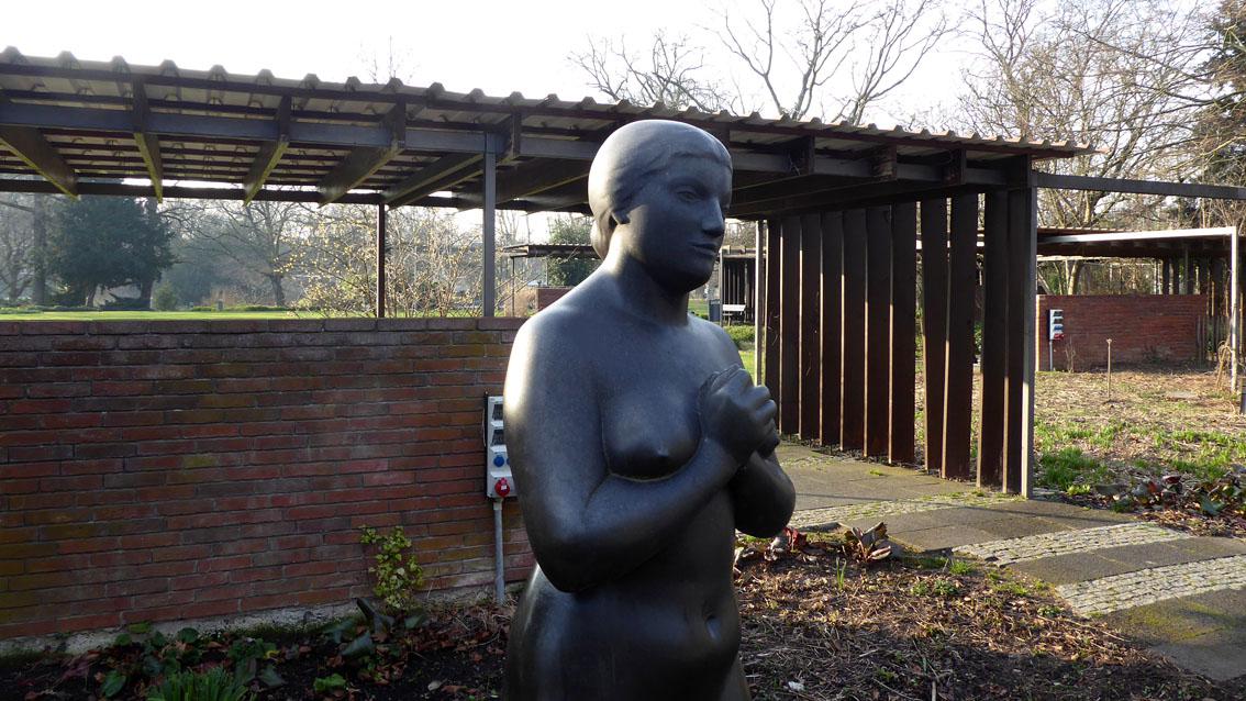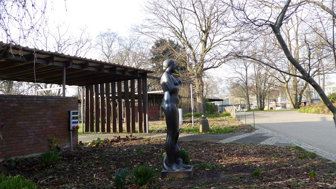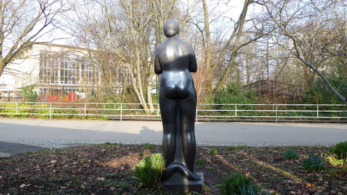 Die Plastik entstand zu einer Zeit, als die Ideologie des aufkommenden Nationalsozialismus ein neues Menschenbild prägte. Die Skulptur zeigt eine junge Frau, zwischen deren Beinen eine dicke Schlange bedrohlich ihren Weg nach oben sucht. Mit einem Ausdruck von Hilflosigkeit begegnet Eva der gefährlichen Annäherung. Die Formensprache des Bildhauers orientiert sich an klassischen Vorbildern. Christoph Voll wurde 1897 in München geboren und starb 1939 in Karlsruhe. Er lehrte ab 1928 Bildhauerei an der Badischen Landeskunstschule, aus der später die Staatliche Akademie der Bildenden Künste Karlsruhe hervorging. Im Jahre 1935 wurde er zunächst 'entpflichtet', später entlassen. Nach 1937 wurde seine Kunst von den Nationalsozialisten als 'entartet‘ diffamiert.