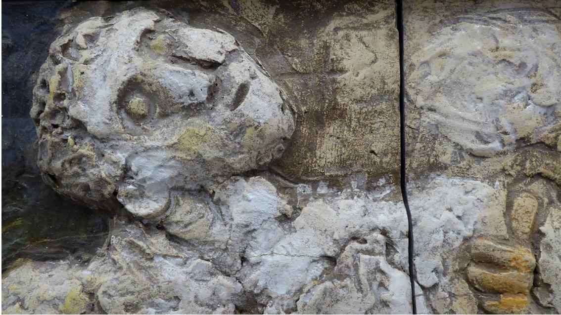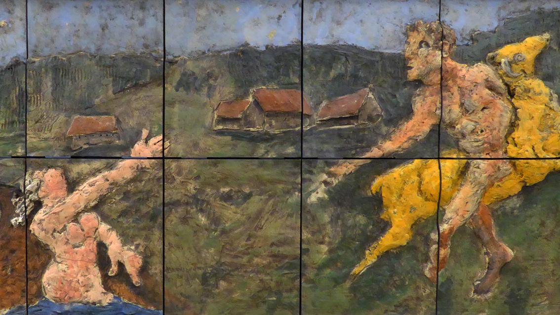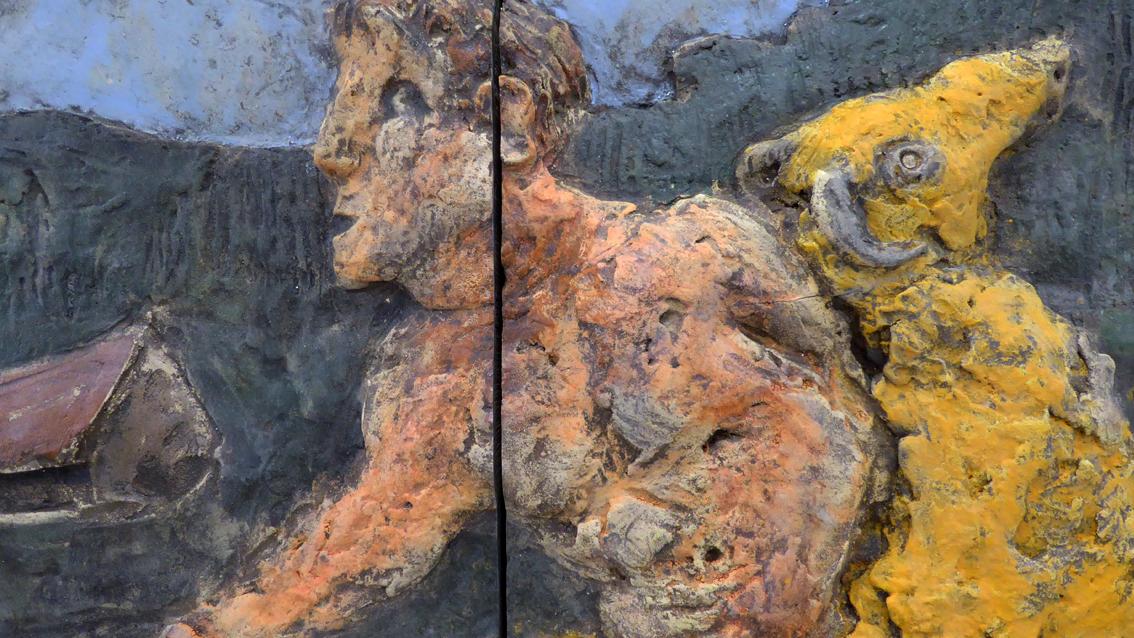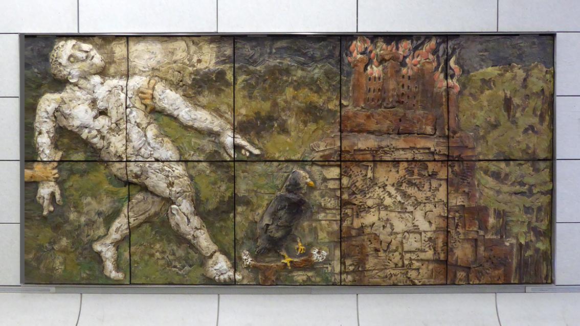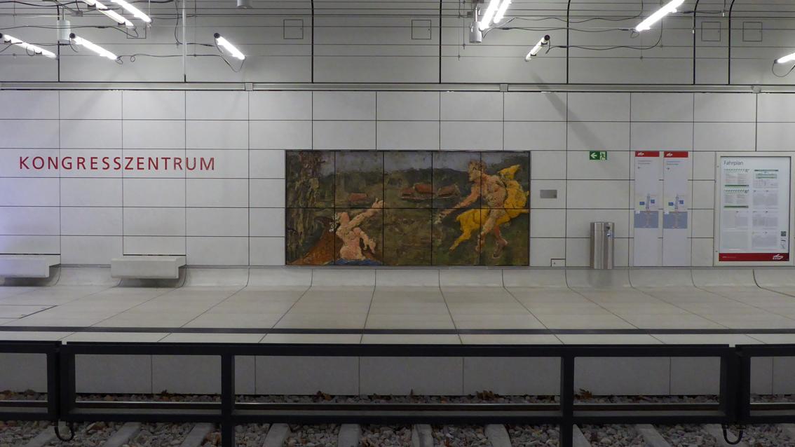 Markus Lüpertz entwarf und verwirklichte für sieben U-Bahn Stationen vierzehn monumentale Wandbilder aus Ton. Ein Relief wurde in der Karlsruher Majolika und die weiteren in der Zeller Keramik-Manufaktur hergestellt. Alle Werke sind zwei Mal gebrannt (Sprüh- und Glasurbrand). Keramik gilt als ein sehr haltbares, witterungsbeständiges Material und ist deshalb für den öffentlichen Raum gut geeignet. Initiiert und finanziert wurde das Projekt von dem Verein ‚Karlsruhe Kunst Erfahren e.V.‘. Entstanden ist eine subjektive Deutung der Schöpfungsgeschichte in Form farbig gefasster Hochreliefs. Diese sind in einer Bildsprache ausgeführt, welche die Wirklichkeit expressiv abstrahiert und surreal überhöht. Sämtliche Keramikbilder werden für 7 Jahre der Stadt Karlsruhe als Leihgabe des Vereins ‚Karlsruhe Kunst Erfahren e.V.‘ überlassen. - An der Haltestelle Kongresszentrum befinden sich die beiden Arbeiten 'Aruru oder die Steppe' und 'Die Brustwehr'. In 'Aruru oder die Steppe‘ begegnen sich eine weibliche und eine männliche Figur über den Kontakt der Blicke und das Spiel der Hände. Beide sind nackt, sie steht im Wasser, er sitzt auf einem goldgelben Schaf. Dem Gilgamesch Epos nach erschafft die Muttergöttin Aruru in der Steppe ein Wesen, das zu zwei Dritteln Mensch und zu einem Drittel Gott ist. In 'Die Brustwehr’ ist links eine durch Farbe, Größe und Nacktheit hervorgehobene, männliche Figur (Talos) in Schräglage zu sehen. Die linke Hand zeigt auf einen Raben, der durch seine Blickrichtung auf einen Hügel verweist, auf dem sich eine in Flammen stehende Burg befindet. - Markus Lüpertz wurde am 25. April 1941 in Reichenberg geboren. Zwischen 1973 und 1986 lehrte er an der Staatlichen Akademie der Bildenden Künste in Karlsruhe. Von 1988 bis 2009 war er Rektor an der Kunstakademie Düsseldorf. Lüpertz ist in erster Linie Maler, allerdings entstehen seit etwa 1980 immer wieder plastische Arbeiten.