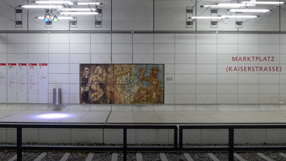 Markus Lüpertz entwarf und verwirklichte für sieben U-Bahn Stationen vierzehn monumentale Wandbilder aus Ton. Ein Relief wurde in der Karlsruher Majolika und die weiteren in der Zeller Keramik-Manufaktur hergestellt. Alle Werke sind zwei Mal gebrannt (Sprüh- und Glasurbrand). Keramik gilt als ein sehr haltbares, witterungsbeständiges Material und ist deshalb für den öffentlichen Raum gut geeignet. Initiiert und finanziert wurde das Projekt von dem Verein ‚Karlsruhe Kunst Erfahren e.V.‘. Entstanden ist eine subjektive Deutung der Schöpfungsgeschichte in Form farbig gefasster Hochreliefs. Diese sind in einer Bildsprache ausgeführt, welche die Wirklichkeit expressiv abstrahiert und surreal überhöht. Sämtliche Keramikbilder werden für 7 Jahre der Stadt Karlsruhe als Leihgabe des Vereins ‚Karlsruhe Kunst Erfahren e.V.‘ überlassen. - ‚Von schönster Gestalt‘ bezieht sich auf die tragische Liebesgeschichte zwischen Orpheus und Eurydike. Die Götter erlauben Orpheus Eurydike aus dem Hades zurück in die Welt zu holen, vorausgesetzt er dreht sich nicht nach ihr um. Wie das Bild zeigt, hält er sich nicht daran. Begleitet vom Klirren des zerbrochenen Spiegels zur Welt, verliert er endgültig seine Geliebte. Die Arbeit ‚Die Königswürde’ zeigt links einen ‚Schneckenmann‘ mit Totenschädel unter rot gefassten Formen, die an Feuer erinnern. Rechts sind zwei Figuren von vorne und eine von hinten dargestellt. Auf dem Oberteil der Person am rechten Bildrand ist ein Kopf mit zwei Hörnern zu sehen. - Markus Lüpertz wurde am 25. April 1941 in Reichenberg geboren. Zwischen 1973 und 1986 lehrte er an der Staatlichen Akademie der Bildenden Künste in Karlsruhe. Von 1988 bis 2009 war er Rektor an der Kunstakademie Düsseldorf. Lüpertz ist in erster Linie Maler, allerdings entstehen seit etwa 1980 immer wieder plastische Arbeiten.