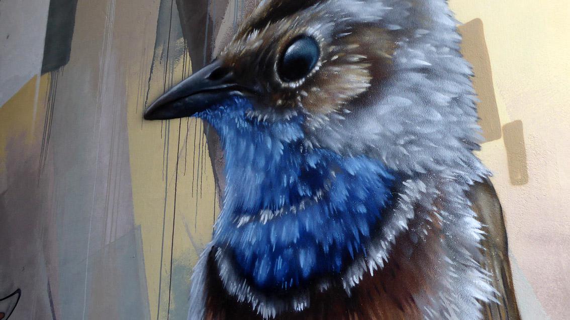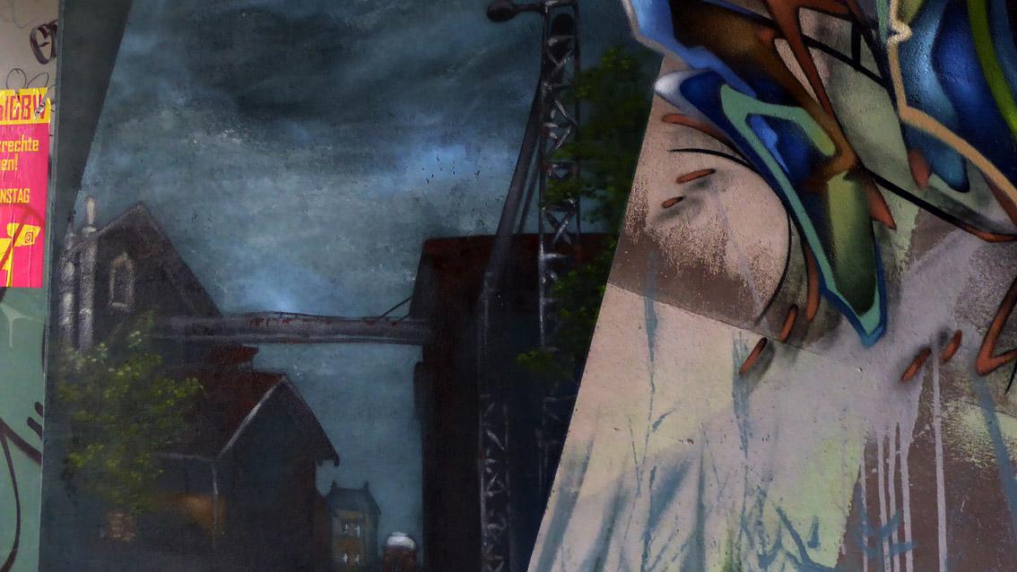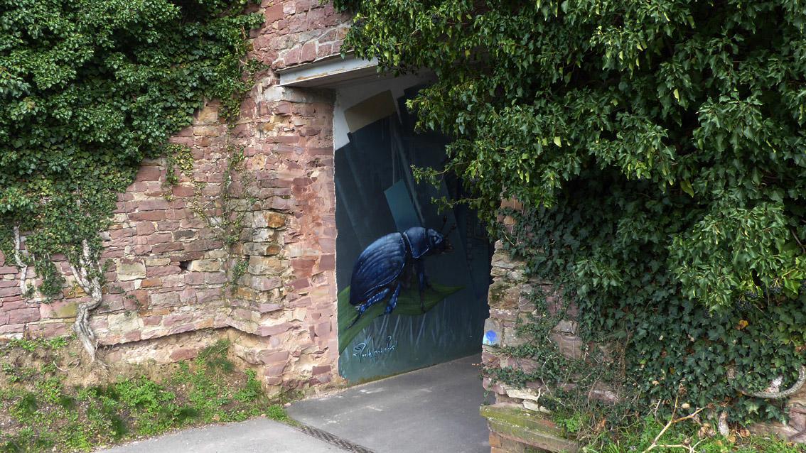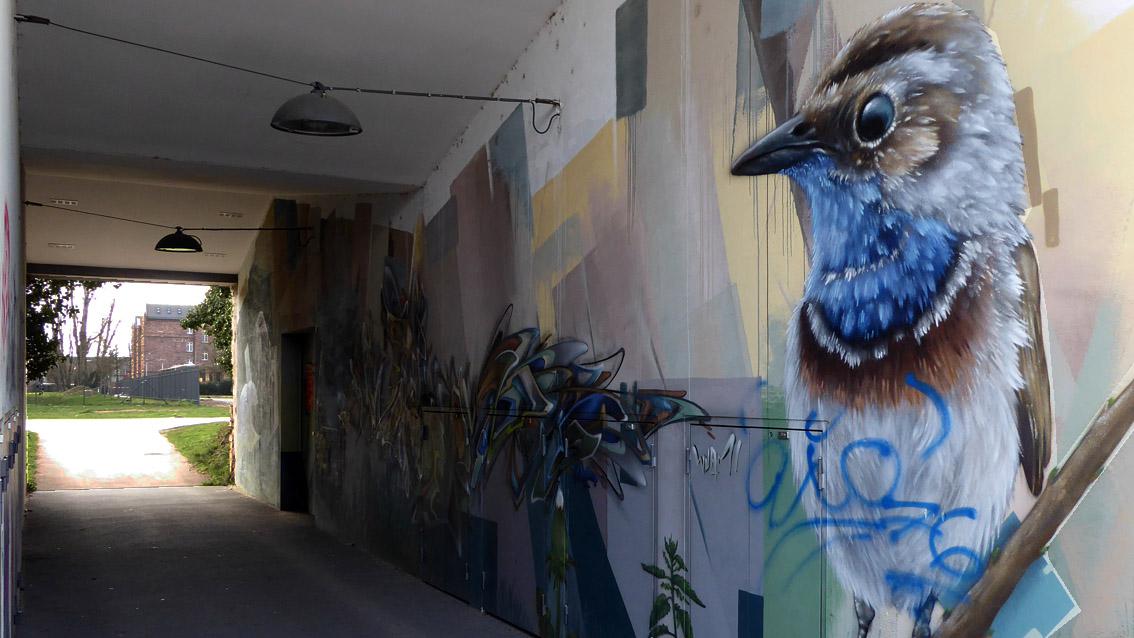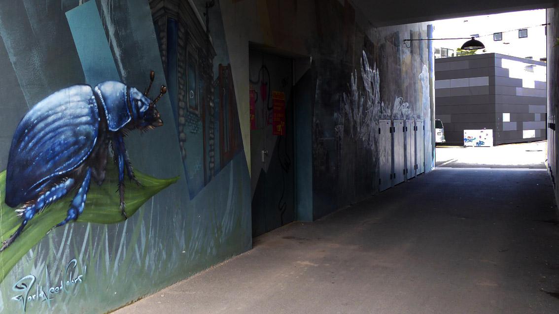 Eine ca. 18 Meter lange Passage verbindet das Gelände der Musikhochschule mit dem Schlachthofareal. Die Nordwand des Durchgangs ist umfassend mit einem Graffiti des Karlsruher Street Art Künstlers Sven R. versehen, der sich auch WUAM (WorldNeedColors) nennt. Zwei stark vergrößerte Tiere markieren Beginn und Ende der Unterführung: ein blaues Insekt auf einem grünen Blatt und ein bunter Vogel auf einem braunen Ast. Dazwischen passieren die Flanierenden geschichtete, geometrische Flächen von zurückgenommener Farbigkeit, eine expressiv gesetzte, für Graffitiinterventionen typische Zeichenfolge sowie ein düsteres Gebäudeensemble.