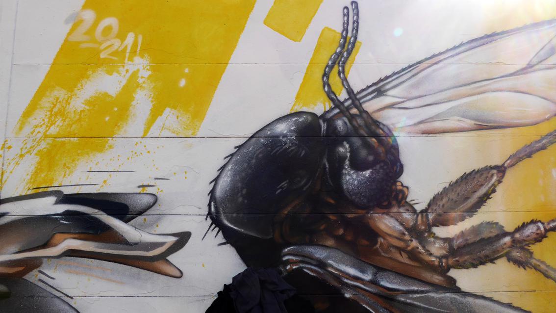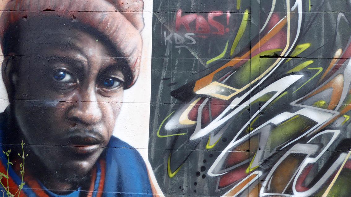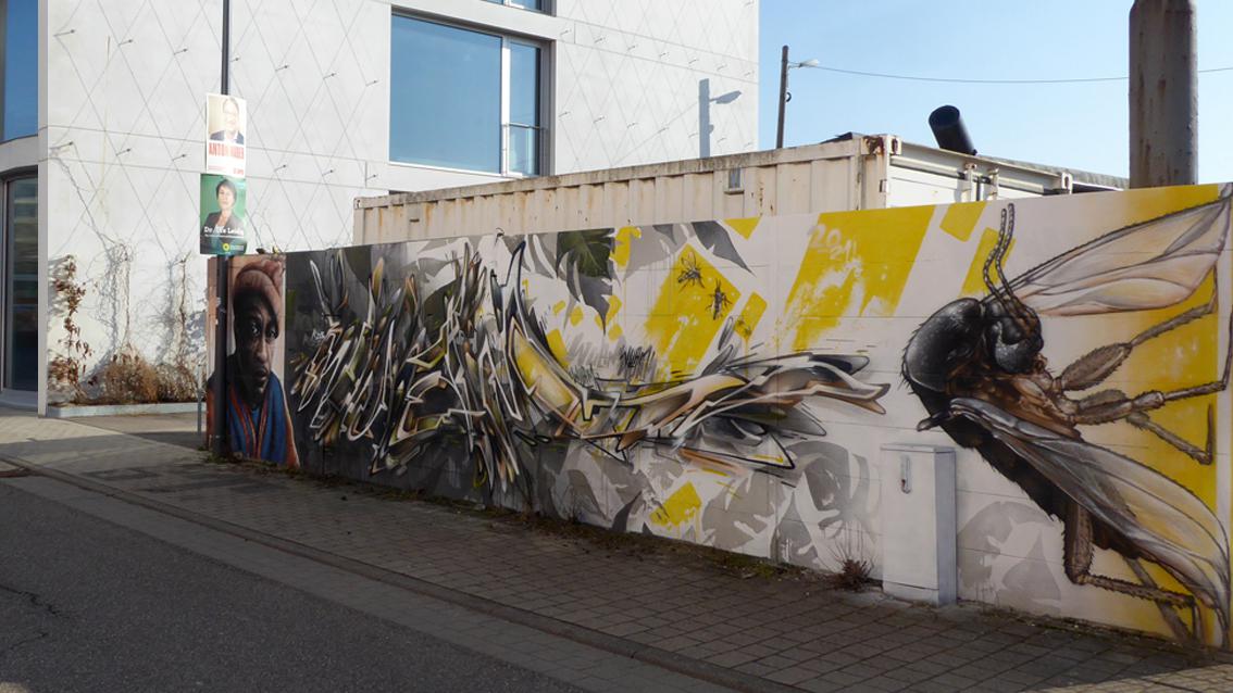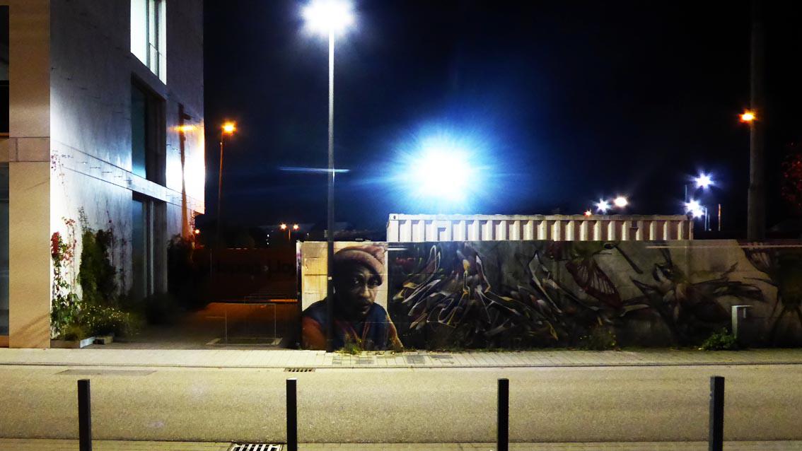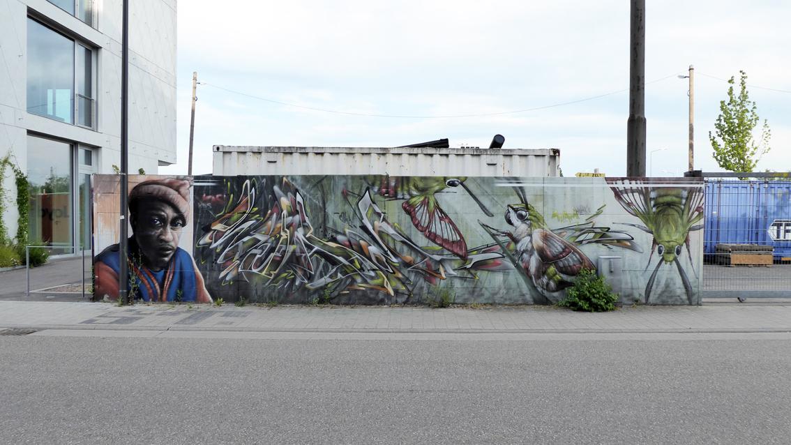 Auf einer ca. 175 cm hohen und 12 Meter breiten Wandfläche an der westlichen Außenmauer des Messplatzes, befindet sich ein Graffiti des Karlsruher Street Art Künstlers Sven R., der sich auch WUAM (WorldNeedColors) nennt. Die figürlichen Teile der Arbeit sind an die Ränder gerückt, im Zentrum dominieren grelle, gestisch gesetzte Zeichen. Am äußeren, linken Rand befindet sich das illusionistische Monumentalporträt eines schwarzen Mannes, der mit großen, blauen Augen Kontakt mit der dreidimensionalen Außenwelt aufnimmt. Sven R. ist dafür bekannt, dass er Teile seiner Wandmalereien ab und zu umdeutet und damit die vorbei Flanierenden immer wieder von neuem überrascht.