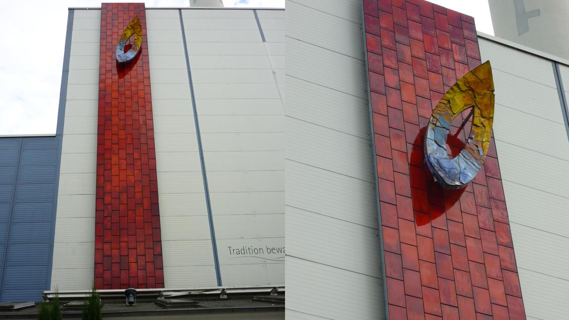Das Werk wurde in Zusammenarbeit mit der Staatlichen Majolika Manufaktur Karlsruhe hergestellt. Am oberen Ende einer langen Bahn aus rot glasierten Kacheln befindet sich eine mehrfarbige Mandorla. Üblicherweise Aura oder Glorie symbolisierend und in der Regel Christus vorbehalten, erscheint die Mandorla hier, losgelöst aus der abendländisch-christlichen Tradition, als Form für sich in einer ausschließlich profanen Umgebung.