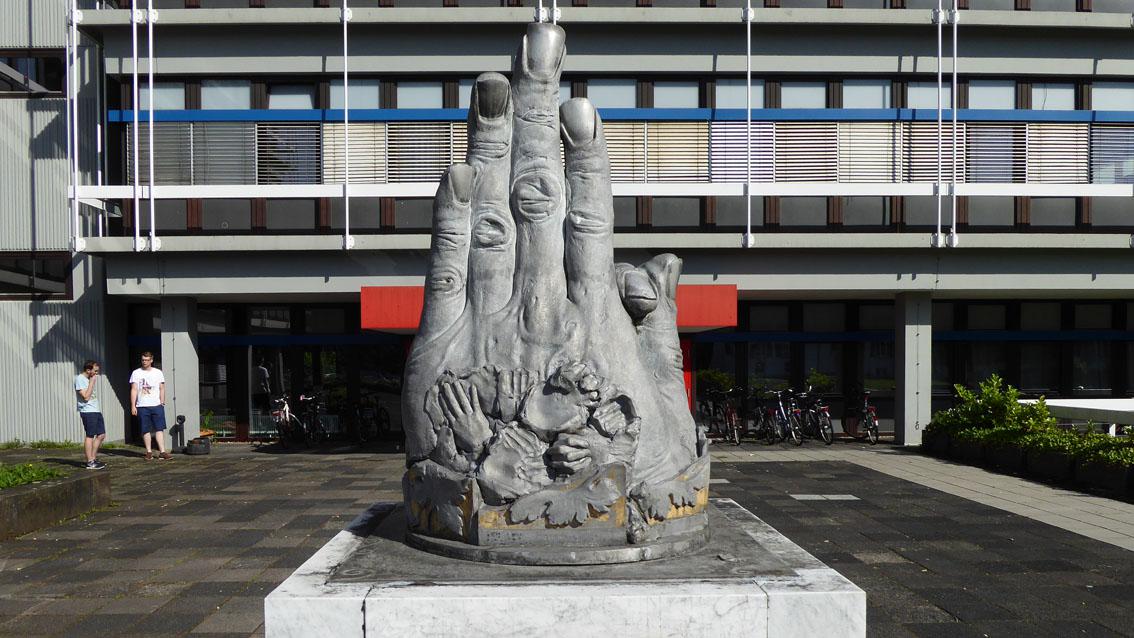 Der ‚Feldhase‘ ist die bekannteste Naturstudie, die ‚Betenden Hände’ das am häufigsten reproduzierte Werk, das ‚Rasenstück‘ das berühmteste Stillleben Dürers. Jochen Goertz, der an der Staatlichen Akademie der Bildenden Künste in Karlsruhe ausgebildet wurde, gestaltete auf der Grundlage der drei Vorbilder zwischen 1978 (Entwurf) und 1980 (Aufstellung) eine rätselhafte, plastische Installation. Bei seinem Kunstwerk ranken die Finger der Hände gekrümmt nach oben, ruht der Hase gelangweilt vor seiner Kiste und wächst ein streichholzähnliches Gebilde mit einem Kopf aus Kunststoff in einem Wildwuchsbeet gegen den Himmel über dem Steinbuch Centre for Computing am KIT, vor dem sich die plastische Gruppe befindet.