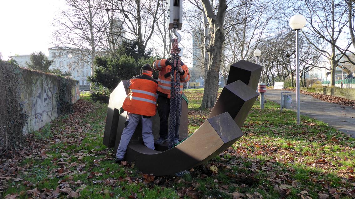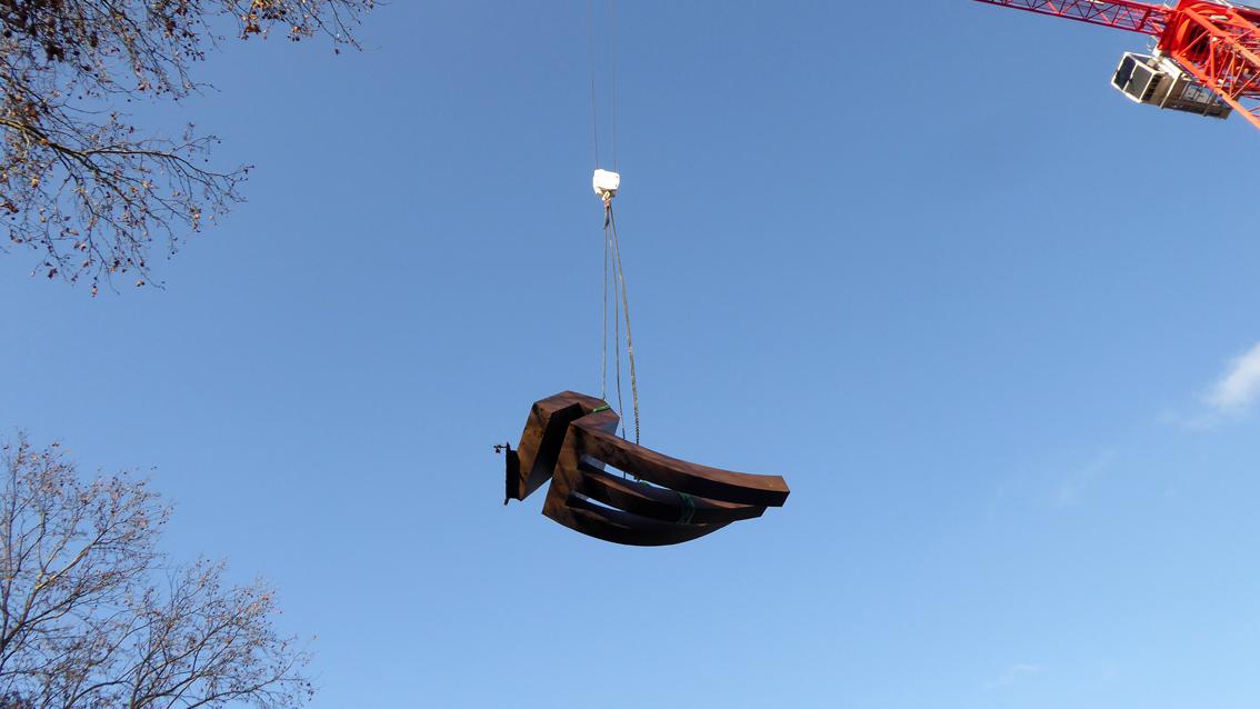 Das Werk des emeritierten Kunstprofessors und Absolventen der Staatlichen Akademie der Bildenden Künste Karlsruhe befand sich auf einer kleinen Erhöhung vor der nordwestlichen Fassade des Badischen Staatstheaters. Dem 'Haus am Boden' entwachsen, himmelwärts ausgerichtet, drei gestaffelt gesetzte, rippenähnliche Formen. Die Plastik ist in Cortenstahl ausgeführt, einer Stahlvariante, die durch Sonne, Regen und Wind eine rotbraune, matte Oberfläche bildet. Das Kunstwerk wurde im Dezember 2019 abgebaut. Da 'Haus am Boden' eine Leihgabe des Künstlers war, kehrt die Stahlplastik wieder ins Atelier von Werner Pokorny zurück.