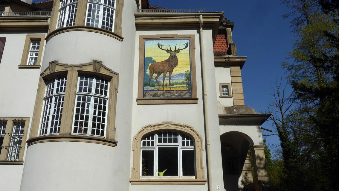 Wilhelm Süs war zusammen mit Hans Thoma Begründer der Staatlichen Majolika Manufaktur Karlsruhe und ihr erster Direktor. An einem Wohnhaus nahe seiner Produktionsstätte befindet sich ein Hirsch, als Wandbild gefertigt aus gebrannten und glasierten Kacheln. Vor einer idyllischen Landschaft aufrecht und stolz stehend, nimmt das Tier Blickkontakt zu den vorbei Flanierenden auf. Wilhelm Süs wurde 1861 in Düsseldorf geboren und verstarb im Jahre 1933 in Mannheim.