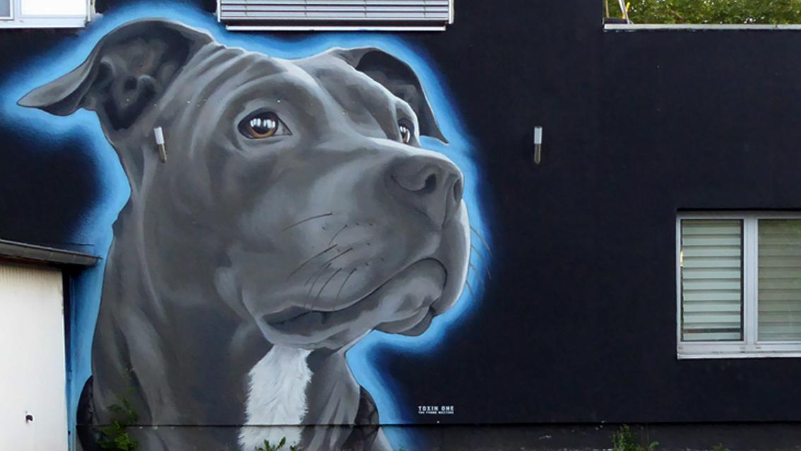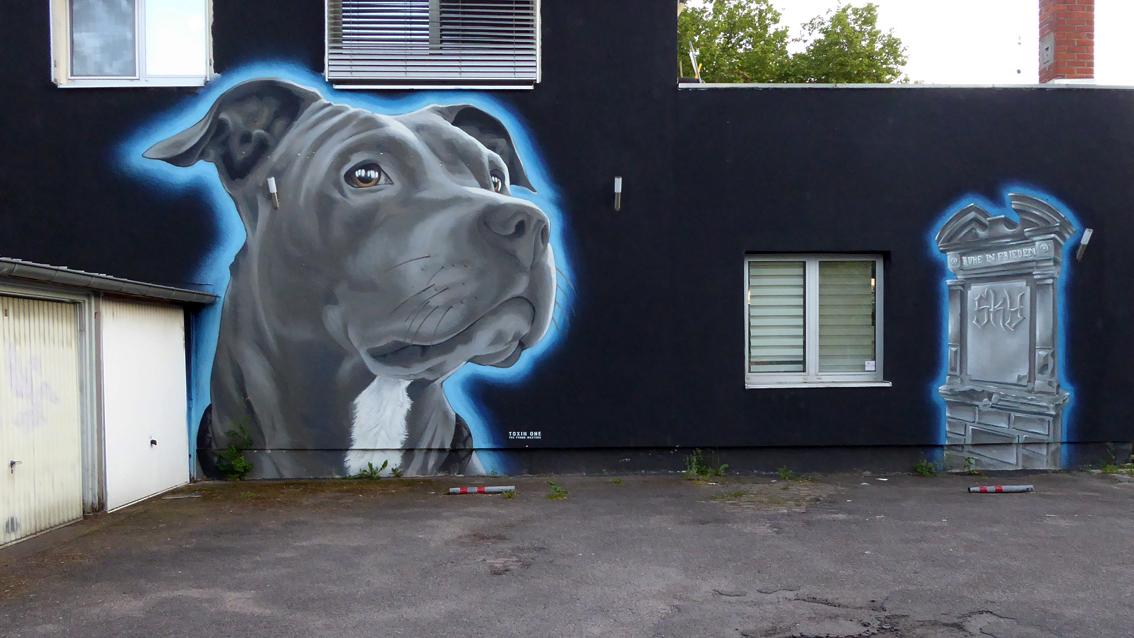 Auf der Hausrückseite des Gebäudes Ecke Ostendstraße und Ludwig-Erhard-Allee befindet sich ein monumentales Porträt eines Hundes und ein Grabstein mit Schriftzeichen. Der naturalistisch dargestellte Hundekopf und das Architekturzitat sind mit einem blauen Linienverlauf umgeben. Der Graffiti- und Streetart Künstler TOXIN ONE ist in Karlsruhe mehrfach vertreten.