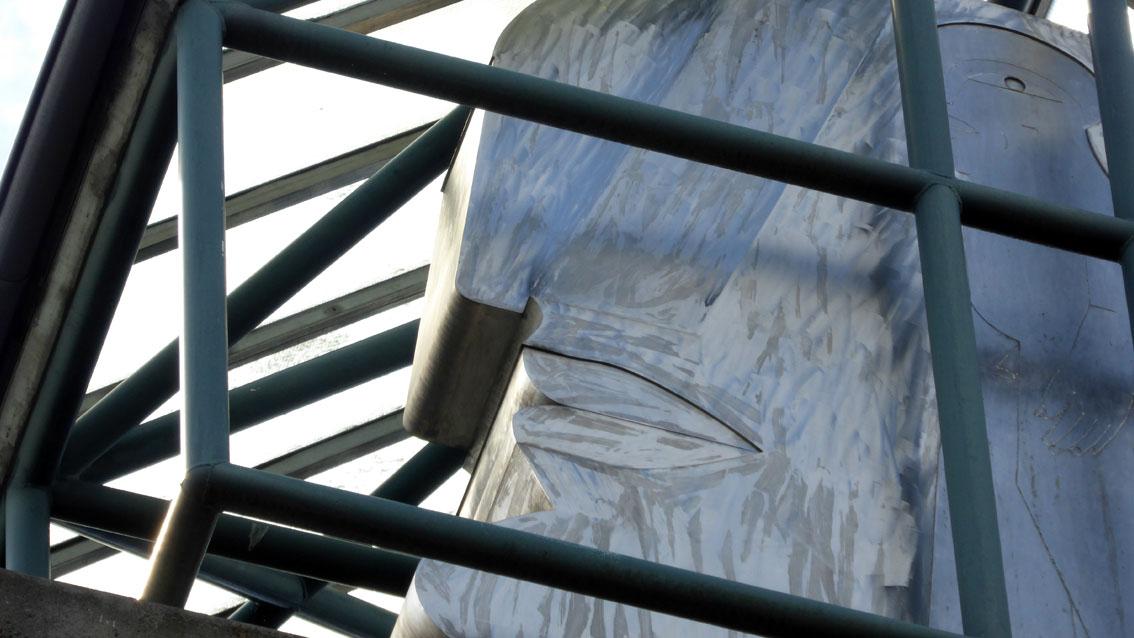 Für den Anbau des Kunsthallenflügels durch Hans Mohl Anfang der 80er Jahre des letzten Jahrhunderts gestaltete der international anerkannte Künstler seinen ‚Karlsruher Kopf‘. In lichter Höhe unter einer glasüberdachten Giebelhauskonstruktion installiert, ist von unten kaum zu erkennen, dass dem silberfarbenen Kopf noch eine stilisierte Figur (‚Kopffüßler‘) eingeschrieben ist.