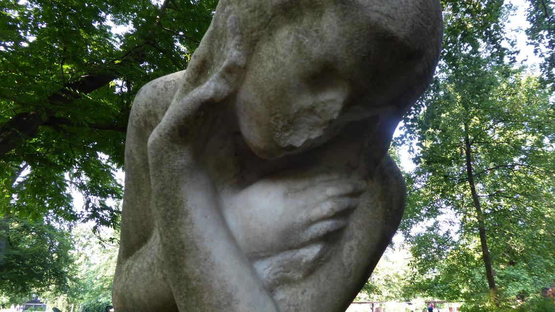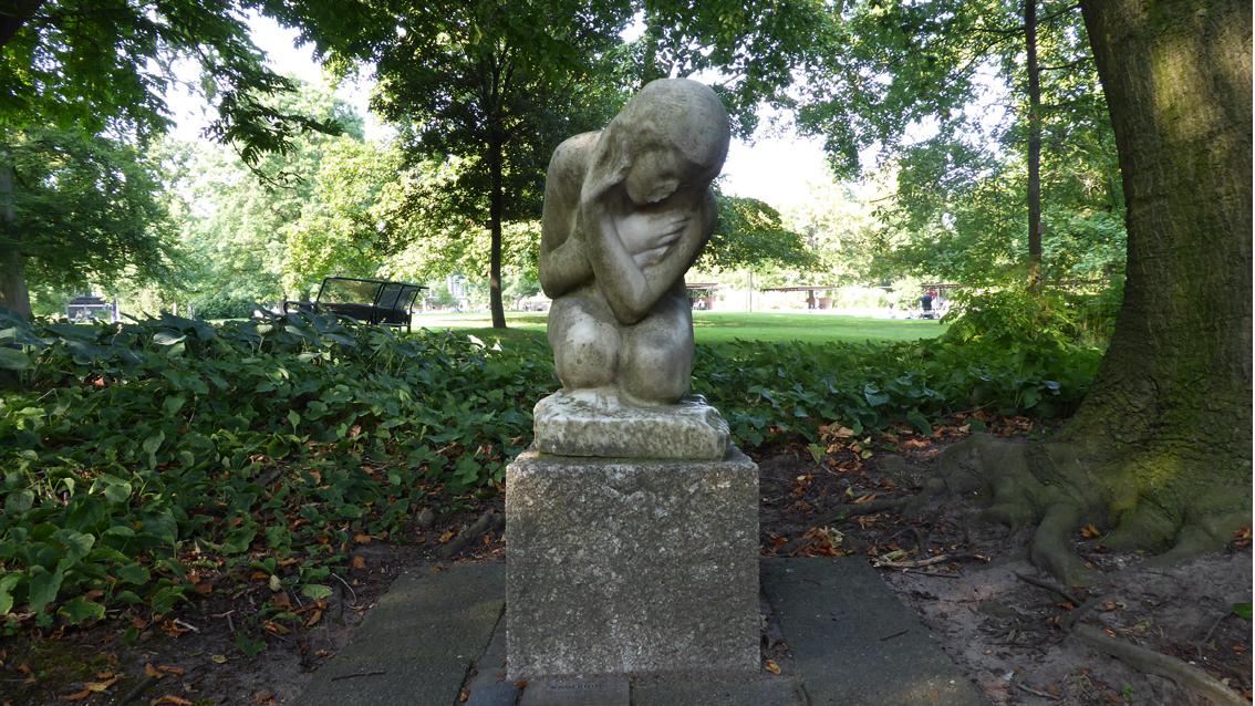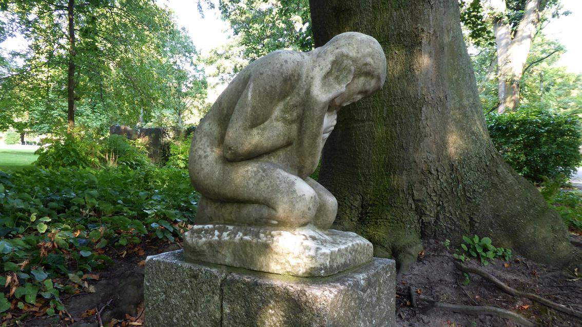 Unbekleidet kniet die weibliche Figur auf einem harten Untergrund. Die weichen und glatten Formen der Kauernden bilden einen Gegensatz zur Rauheit der felsigen Bodenfläche. Mit vereinfachten, plastischen Mitteln zeigt der Künstler den Menschen im Zustand von Demut, Versunkenheit und Schutzlosigkeit. Die Skulptur befindet sich im Waldstaudenbereich des Zoologischen Stadtgartens. Hermann Föry war Meisterschüler von Prof. Georg Schreyögg und Prof. Christopf Voll an der Staatlichen Akademie der Bildenden Künste Karlsruhe, die mit repräsentativen Skulpturen ebenfalls im Zoologischen Stadtgarten vertreten sind. Hermann Föry ist auch der Autor der 'Marktfrau' auf dem Platz hinter der 'Kleinen Kirche' im Zentrum Karlsruhes.