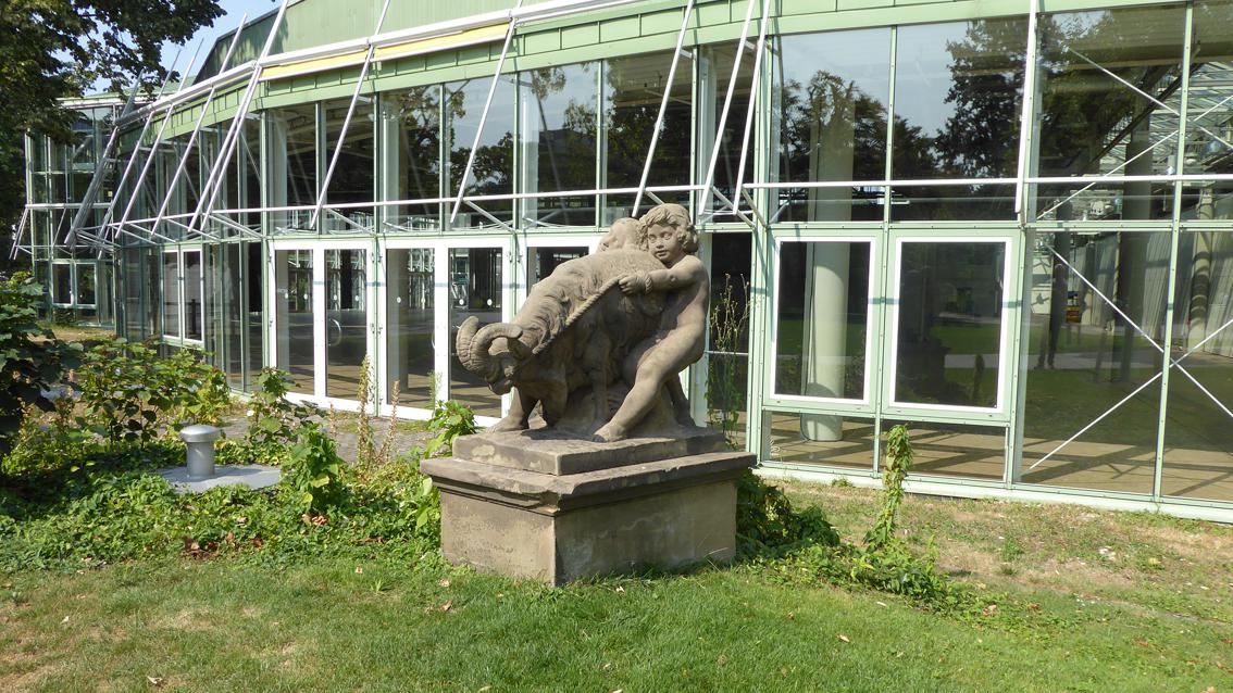 Kinder und Ziegenbock befinden sich im Zustand vitaler Verbundenheit. Ein spielerisches Kräftemessen mit gegenläufigen Bewegungen bestimmt die Skulptur, die inhaltlich und formal von klassischen Vorbildern inspiriert ist. Der Standort befindet sich vor der Gartenhalle nahe dem Exotenhaus.