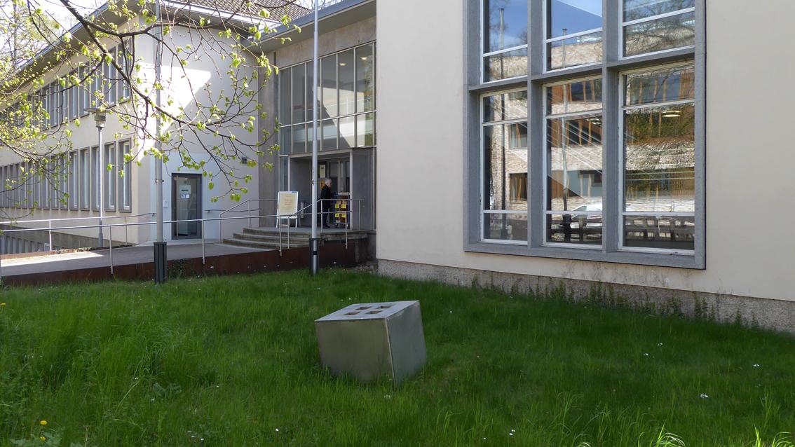 Der Künstler installierte seinen mit Vertiefungen versehenen Würfel leicht geneigt auf einer Rasenfläche vor dem Durlacher Finanzamt. Die Arbeit wurde vom Regierungspräsidium bei der damals in Durlach ansässigen Galerie Rösch erworben und dem Finanzamt als Dauerleihgabe überlassen. Als Symbole der Naturkraft waren ursprünglich Wasser, Pflanzen und Erde in die kleinen Edelstahlschächte eingelassen.
