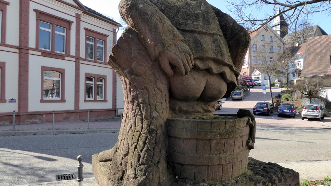 Üblicherweise verrichtete man früher seine menschlichen Bedürfnisse auf Misthaufen, bis jemand auf die Idee kam, Kübel (Kiwwel) an stillen Örtchen des Dorfes aufzustellen. Deren Entleerung zur Düngung der dorfnahen Gärten wurde noch Anfang des 19.Jahrhunderts als Prozession inszeniert: ‚Begenet man einer solchen Procession mit Kübeln, so eilet man, was man kann, um seine Nase in Sicherheit zu bringen‘, so der süddeutsche Amtsarzt Dr. Gruber im Jahre 1808. Der figürliche Teil des Lammplatz-Brunnens verweist auf einen ‚Kiwwelscheißer‘, geruchfrei aus Sandstein geschlagen, an einer viel befahrenen Straße aufgestellt und Tag für Tag die Prozession stinkender Autos verfolgend…