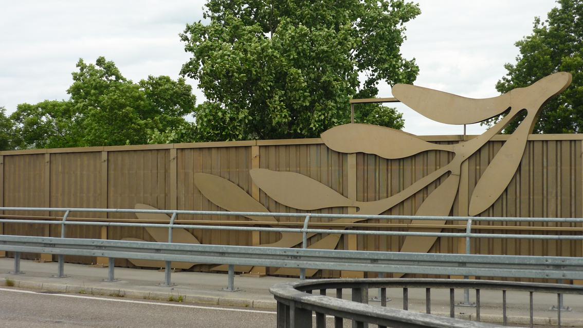 Das in seiner Breitenausdehnung monumentale Werk entstand in Zusammenarbeit mit GJL Architekten Karlsruhe. Es ging als Siegerarbeit aus einem Realisierungswettbewerb im Jahre 2005 hervor. Aufgabenstellung war, dass die zu erstellenden Lärmschutzkonstruktionen in ihrer Gestaltung den Straßen- und Landschaftsraum neu und positiv definieren sollen. Der Heilbronner Künstler Peter Riek löste die Aufgabe, indem er die Leichtmetallwände mit einem durchlaufenden Blattmotiv versah.